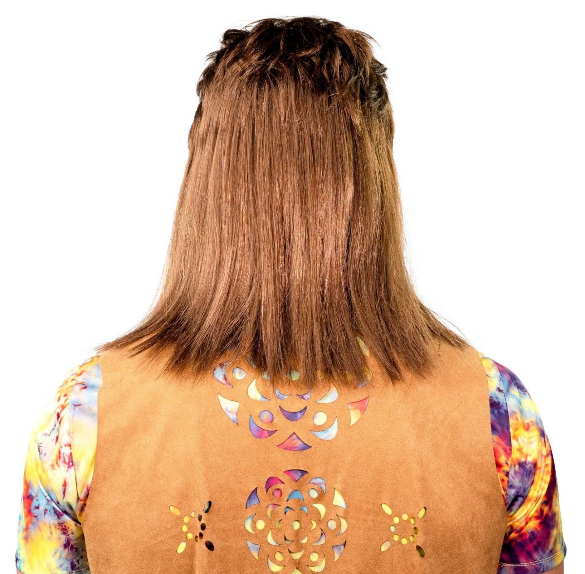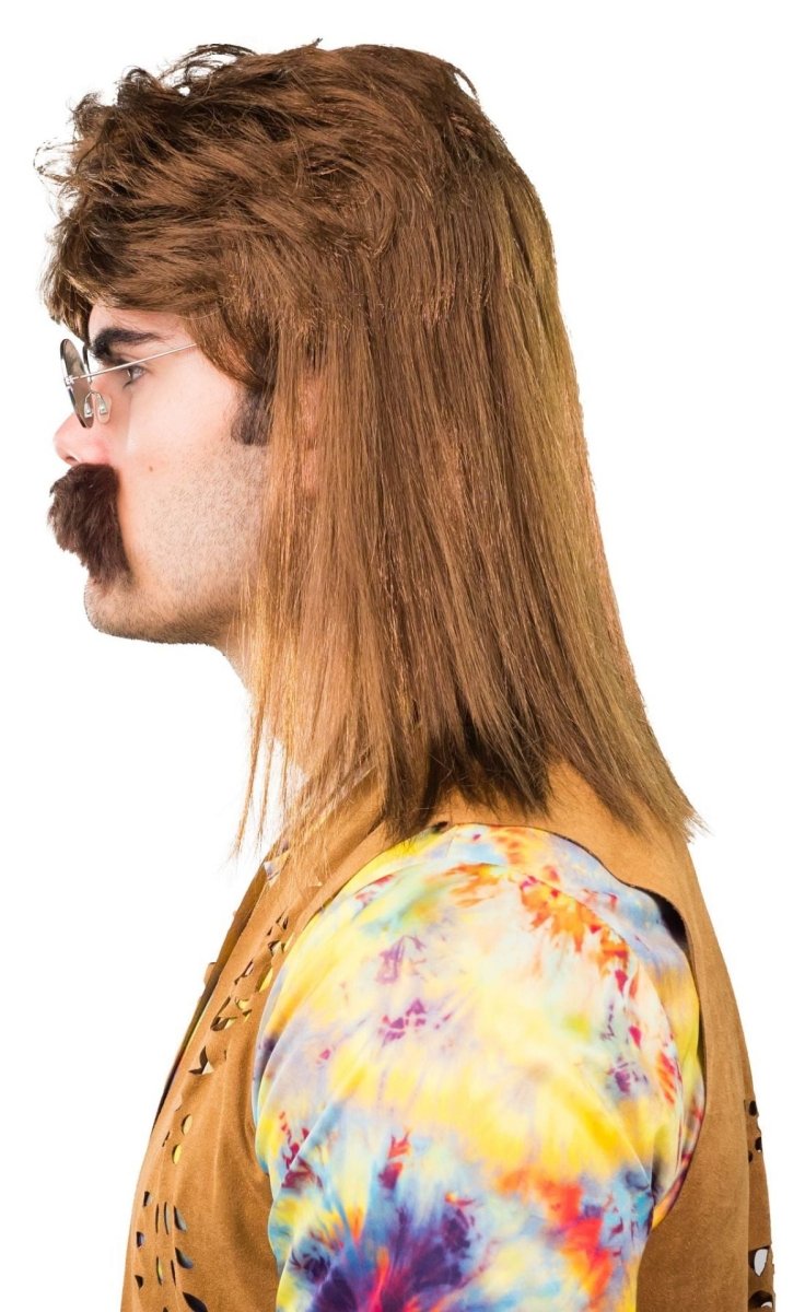 Täydellinen 80-luvun tyyli tällä pitkällä miesten peruukilla, jossa on yhteensopivat viikset. Täydellinen huonoihin juhliin, naamiaisiin, karnevaaleihin tai naamiaisjuhliin.