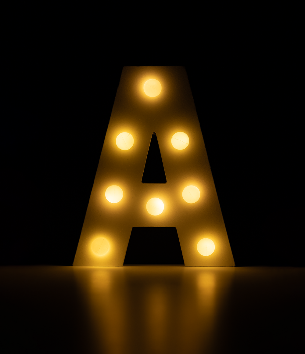 Valokirjainten avulla voit luoda omia sanoja ja lauseita tunnelmallisella tavalla. Mukana paristo.