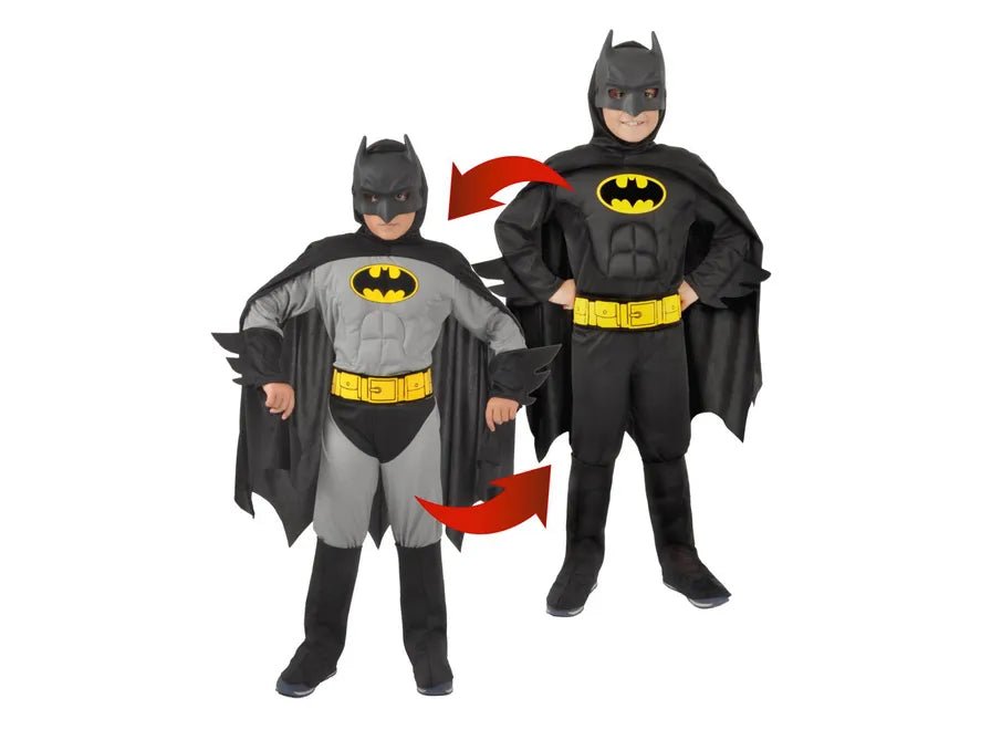 Luo lasten muuttua legendaariseksi Pimeäksi ritariksi tällä käännettävällä Batman-muskelipuvulla. Kaksoismallin ansiosta on helppo vaihtaa kahden ikonisen Batman-ilmeen välillä.