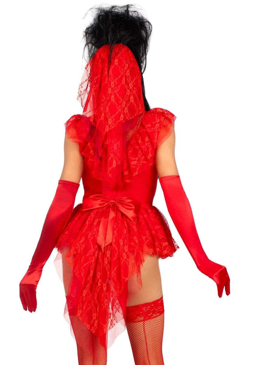Muunnu vietteleväksi versioksi Lydia Deetzistä elokuvasta Beetlejuice tällä näyttävällä Beetle Babe -asulla! Tämä Halloween-asu sisältää pitsisen ruffle-garter bodyn, pin-on bustle-keulan ja sopivan punaisen hunnun erehtymättömän morsiuslookin makaaberilla twistillä. Yhdistä se kyynärpäihin ulottuvien hanskojen ja reisiin ulottuvien sukkahousujen (eivät sisälly) kanssa, jotta ilmeestäsi tulee vieläkin seksikkäämpi ja karmivampi! 👻💋