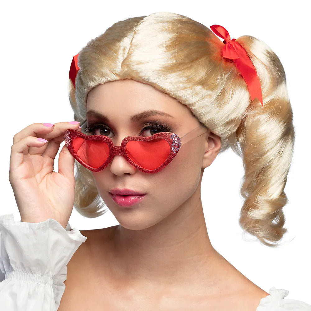 Säteile karnevaaleilla tai naamiaisissa kuin todellinen 50-luvun tyttö tällä vaalealla peruukilla, jossa on letit. Lisätyt punaiset nauhat antavat leikkisän lisän. Tämä peruukki on täydellinen valinta myös silloin, kun haluat tehdä asustasi nukkemaisemman tai tyttömäisemmän.