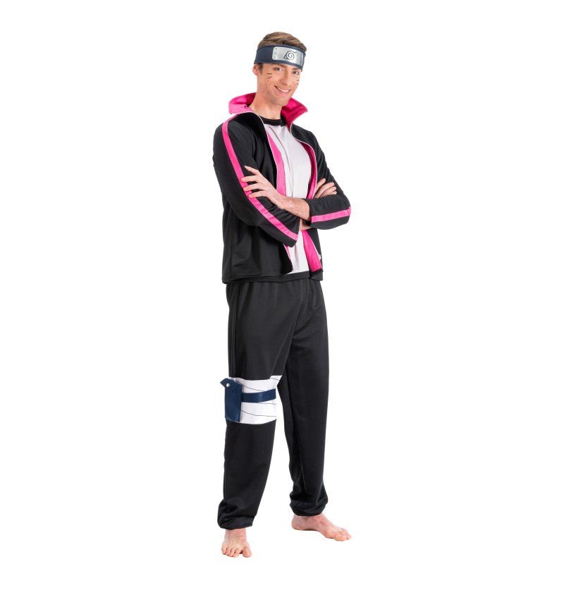 Musta/vaaleanpunaisessa harjoitustakissa on valkoinen vetoketju edessä. Tietenkään selässä olevaa tunnusta ei myöskään ole jätetty pois. Integroidun kuminauhan ansiosta mustat housut ovat erittäin mukavat jalassa. Toimitukseen sisältyy tarrakiinnitys, sääritasku ja yhteensopiva otsapanta. Otsapannan etupuolella on Konohagakuren kylän symboli, johon shinobi kuuluu. Tässä aidossa mangapuvussa voit muuttua kapinalliseksi ninjataistelija Borutoksi. Täydellinen Mardi Gras, karnevaalit, Cosplay ja teemabileet!
