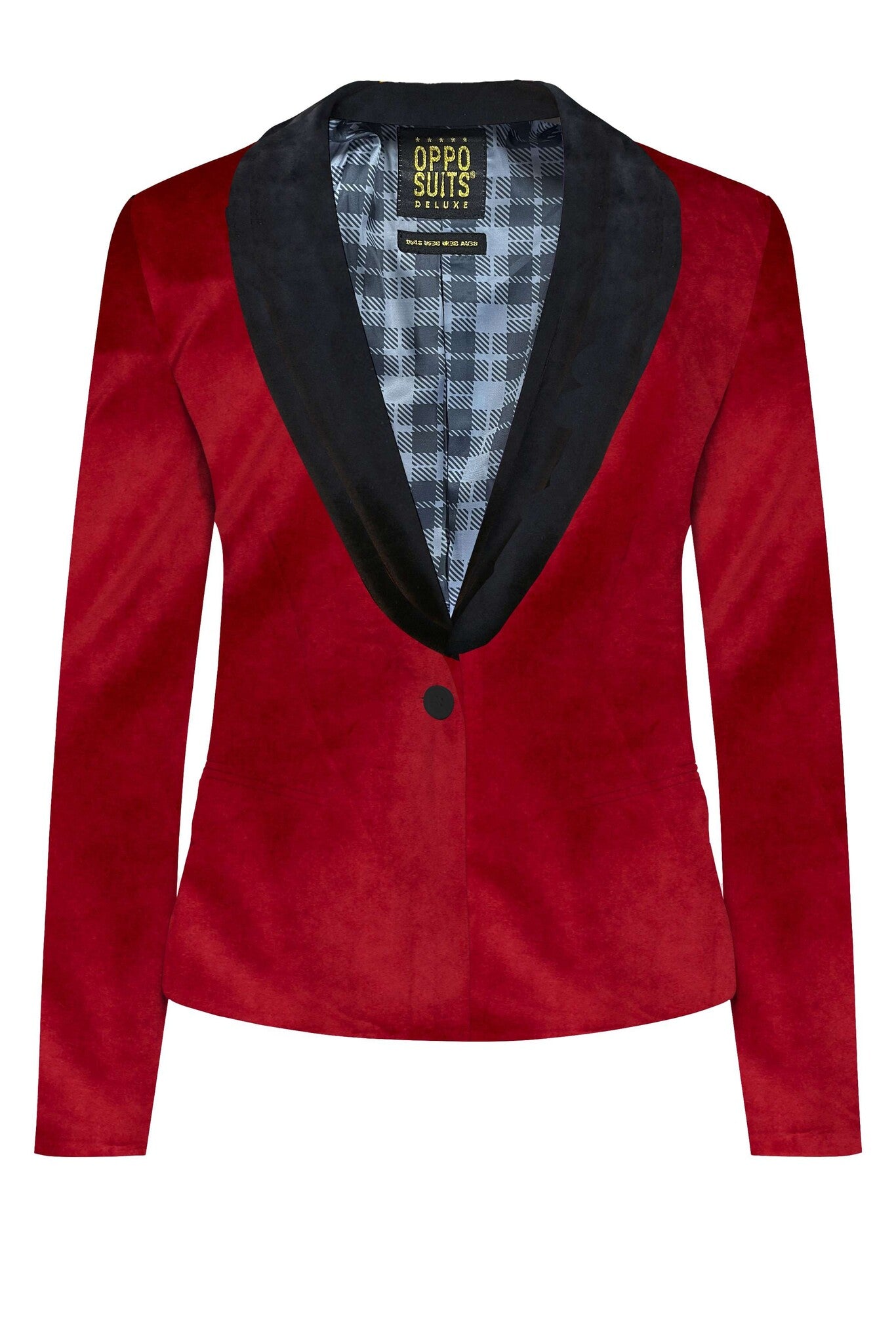 Hienostunut ja tyylikäs, mutta silti helppo käyttää: tämä bordeaux'n värinen samettinen illallistakki, jossa on musta huivinläpyskä, kuuluu jokaisen naisen vaatekaappiin. Pehmeä ja sileä OppoSuits Deluxe -takki on paras ystäväsi koko juhlakauden ajan (ja sen jälkeenkin - se on ajaton).
