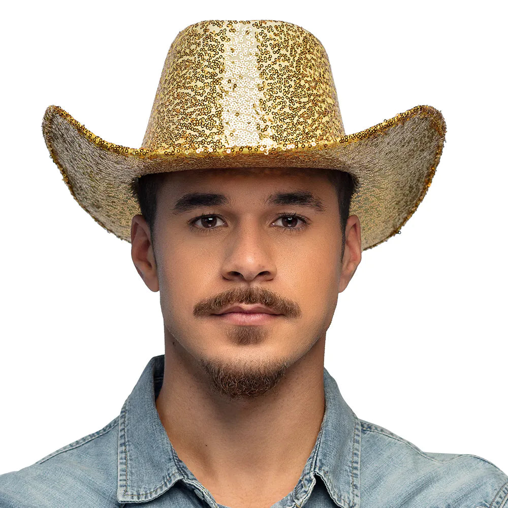 Tässä kauniissa kultaisessa Rodeo Party -cowboy-hatussa, jossa on kiiltäviä paljetteja, on lumoava ja kova ilme, joka tekee siitä sopivan erilaisiin tilaisuuksiin. Ainutlaatuinen cowboy-hattu, joka voi täydentää minkä tahansa asun lännenpuvun karnevaali- tai festivaaliasuksi!