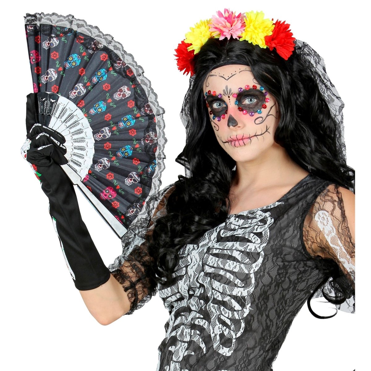 Dia de Los Muertosin inspiroima iloinen viuhka, joka sopii täydellisesti juhlalliseksi koristeeksi tai lisävarusteeksi teemajuhliin.