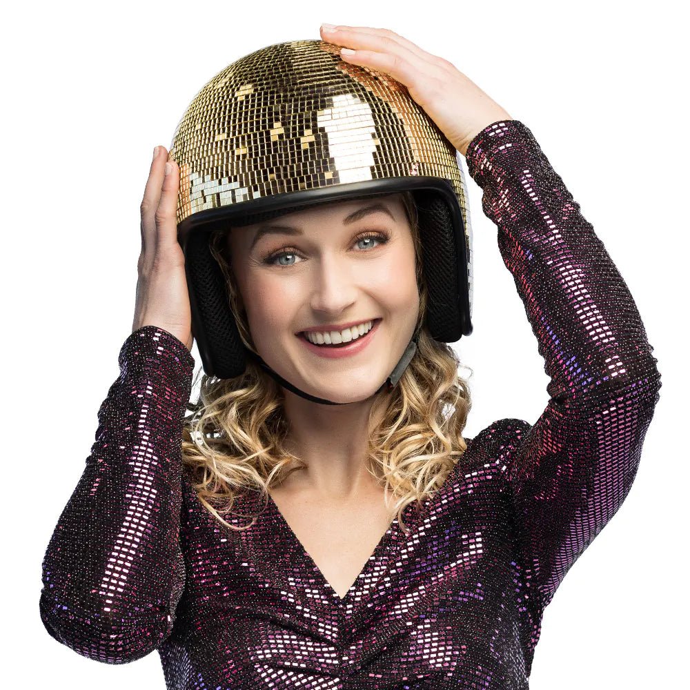 Vaikuta kaikkiin juhliin tällä huomiota herättävällä kultaisella diskokypärällä. Ihanteellinen foulbileisiin, 70/80-luvun teemajuhliin tai karnevaaleihin! Kimaltelevat kultaiset peilit antavat asullesi välittömän juhlailmeen. Säädettävän hihnan ansiosta kypärä pysyy tukevasti paikallaan myös hurjimpien tanssiliikkeiden aikana.
