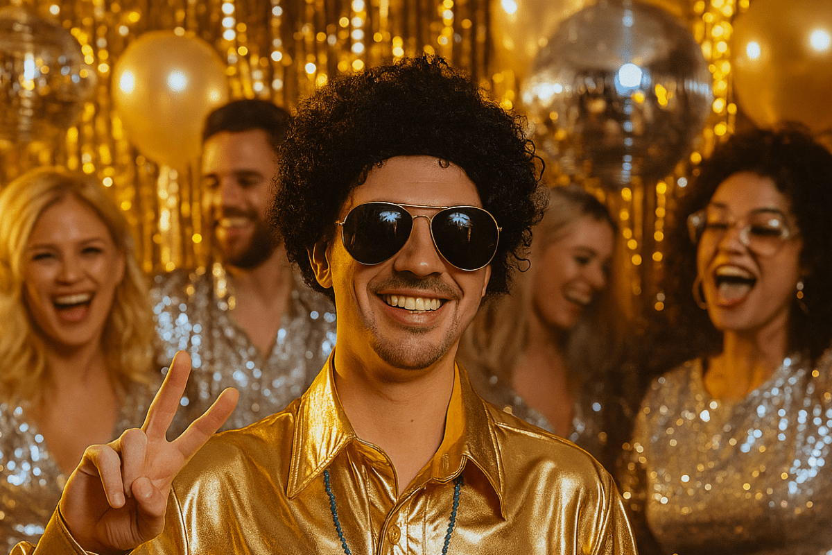 Pukeudu täydellisesti tähän kiiltävään kultaiseen miesten pukuun! Setti sisältää paidan, housut, peruukin, silmälasit ja kaulakorun, joten olet heti valmis karnevaaleihin, naamiaisiin tai naamiaisjuhliin. Valmistettu polyesteristä mukavan istuvuuden ja juhlallisen ulkonäön takaamiseksi.