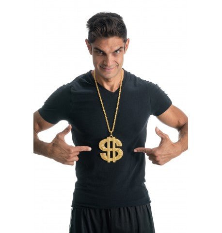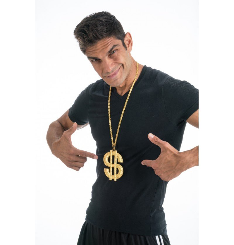 Täydennä hiphop- tai gangsta-ilmeesi tällä huomiota herättävällä 100 cm pitkällä kaulakorulla, jossa on suuri 11 x 10 cm:n dollarin merkki metallista, joka sopii täydellisesti teemajuhliin, naamiaisiin tai festivaaleille