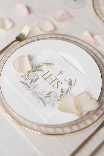 Paperiset lautasliinat IHS, valkoinen, kultainen painatus, koko taiton jälkeen n. 33 x 33 cm, koko taiton jälkeen n. 16,5 x 16,5 cm. (1 pkt/12 kpl)