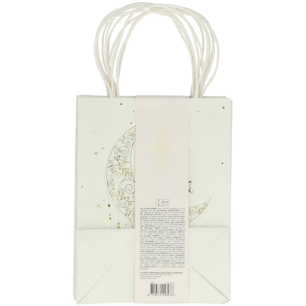 Jaa ilo ja onni. Lahjapussit 'Eid Mubarak', 20 x 10 x 27 cm, 6 kpl. Sisältö: 6 lahjapussia. Käytetään esimerkiksi seuraavissa juhlissa/juhlissa: Eid Mubarak. Tämän lahjapussin avulla on mukava saada ja antaa. Pussin molemmille puolille on painettu (kuumapainatus) sanat "Eid Mubarak" kimaltavin kultaisin kirjaimin. Kädensijat on valmistettu juutista, joka on kääritty paperiin. Tämä tuote on valmistettu paperista.