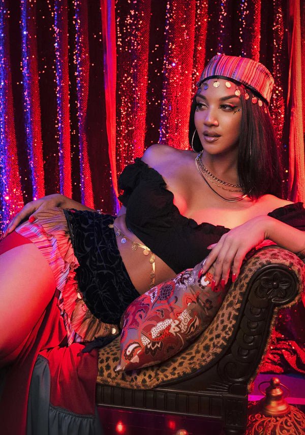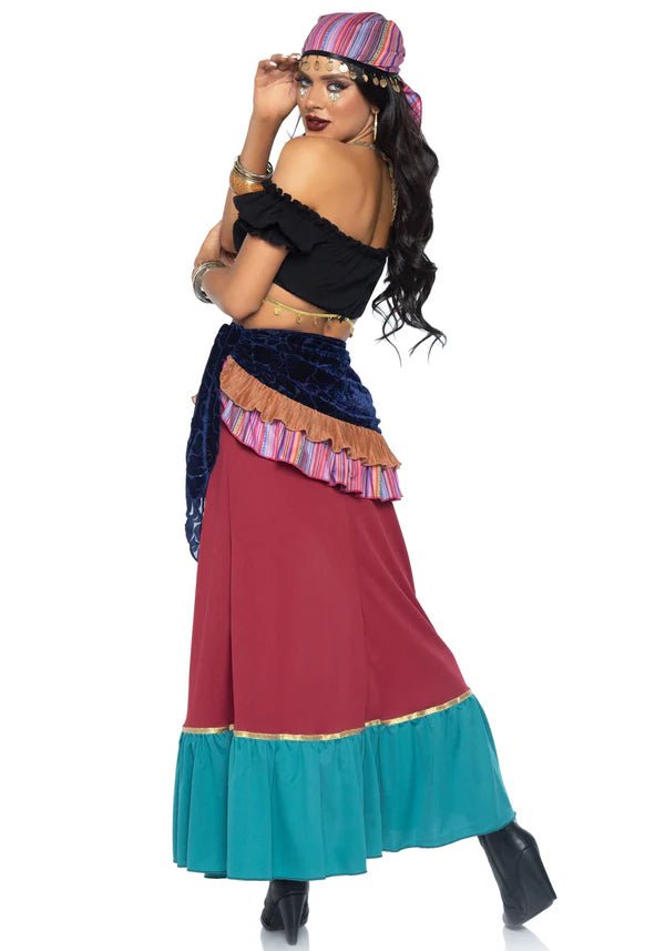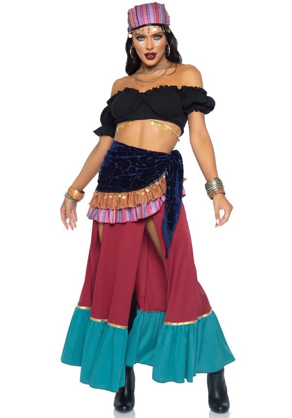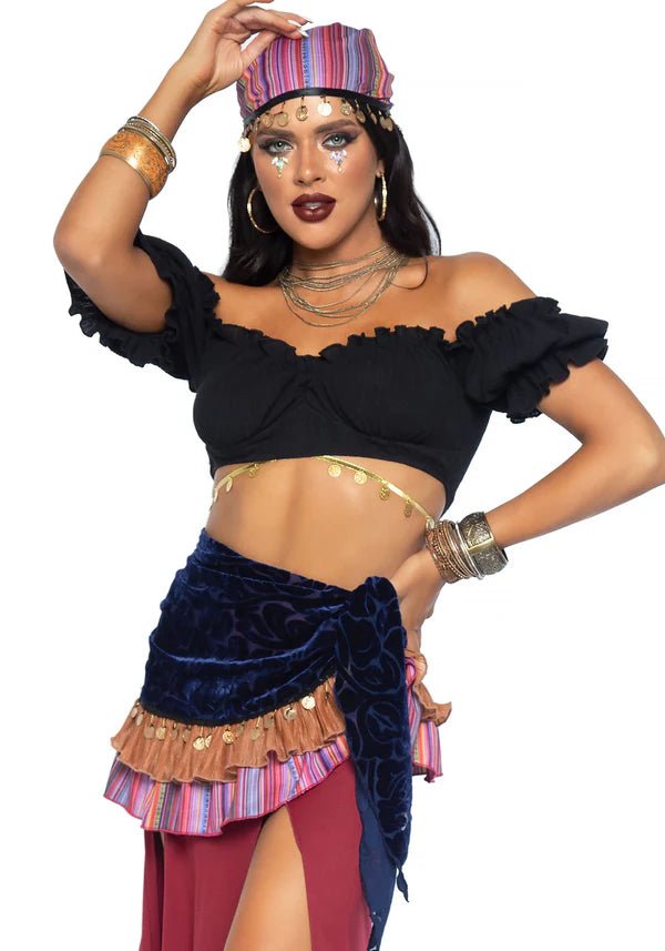 Vapauta taikasi tässä 3-osaisessa Crystal Ball Beauty -asussa Leg Avenuelta! Tähän seksikkääseen mustalaispukuun kuuluu leikattu yläosa, jossa on kolikoilla koristeltu huivi, kaksoishalkiollinen hame ja röyhelöillä varustettu samettivyö. Täydellinen Halloweeniin, karnevaaleihin tai mihin tahansa teemajuhlaan, jossa haluat näyttää maagisen puolesi! 💫🌙