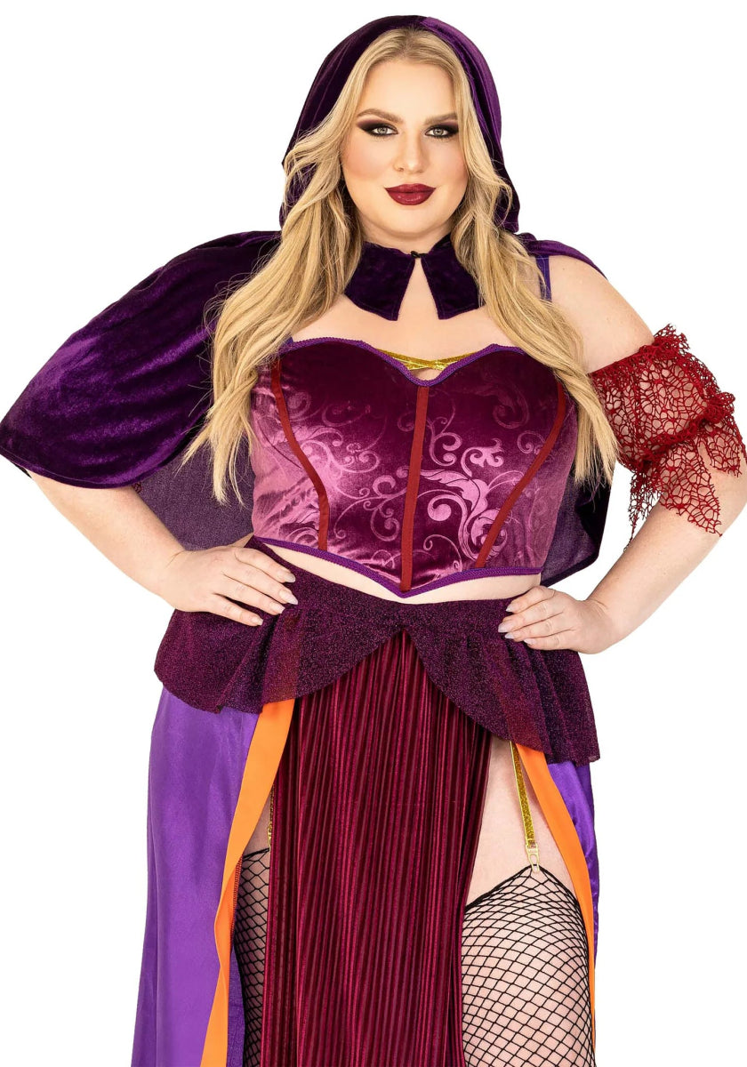 Vapauta sisäinen tumma jumalatar tällä 3-osaisella Sarah-puvulla! Tämä rohkea ja lumoava setti sisältää samettisen crop topin, pitkän hameen, jossa on kaksinkertainen halkio ja kimalteleva joustava henkseli sekä mystisen viitan, jossa on terävä huppu. Täydellinen teemaan statement aikana Halloween tai teemabileissä! 🌙🖤