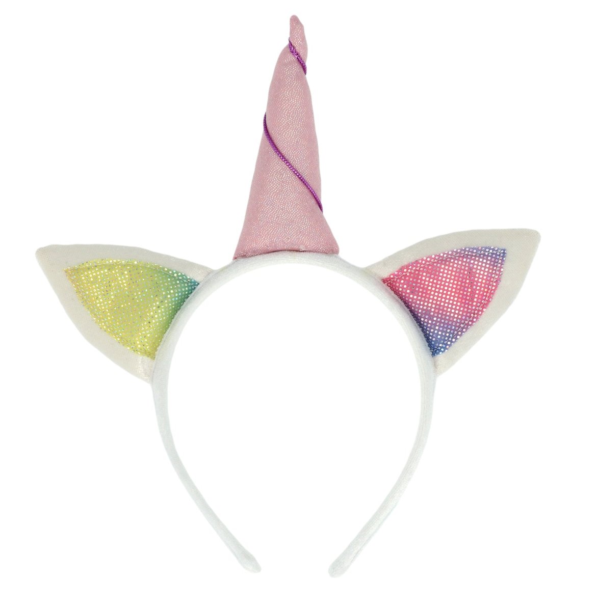 Kahdella täytetyllä yksisarvisen korvalla, joissa on sateenkaarenkimallikangas, joka antaa realistisen ja iloisen vaikutelman.