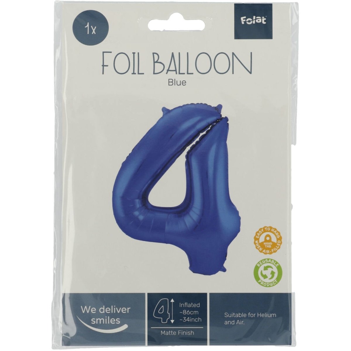Kaunis iso foliopallo numerosta 4 metallisella mattapintaisella sinisellä värillä. Sisältö: 1 foliopallo, jonka pituus on 86 cm. Väri: sininen. Ilmapallossa on kätevät ripustuslenkit, joten se on helppo ripustaa. Käytettävissä esimerkiksi seuraavissa juhlissa/juhlatilaisuuksissa: Syntymäpäivä, lastenjuhlat ja vuosipäivä. Tämän foliopallon koko on 34 tuumaa/86 cm. Tuote on valmistettu foliosta.