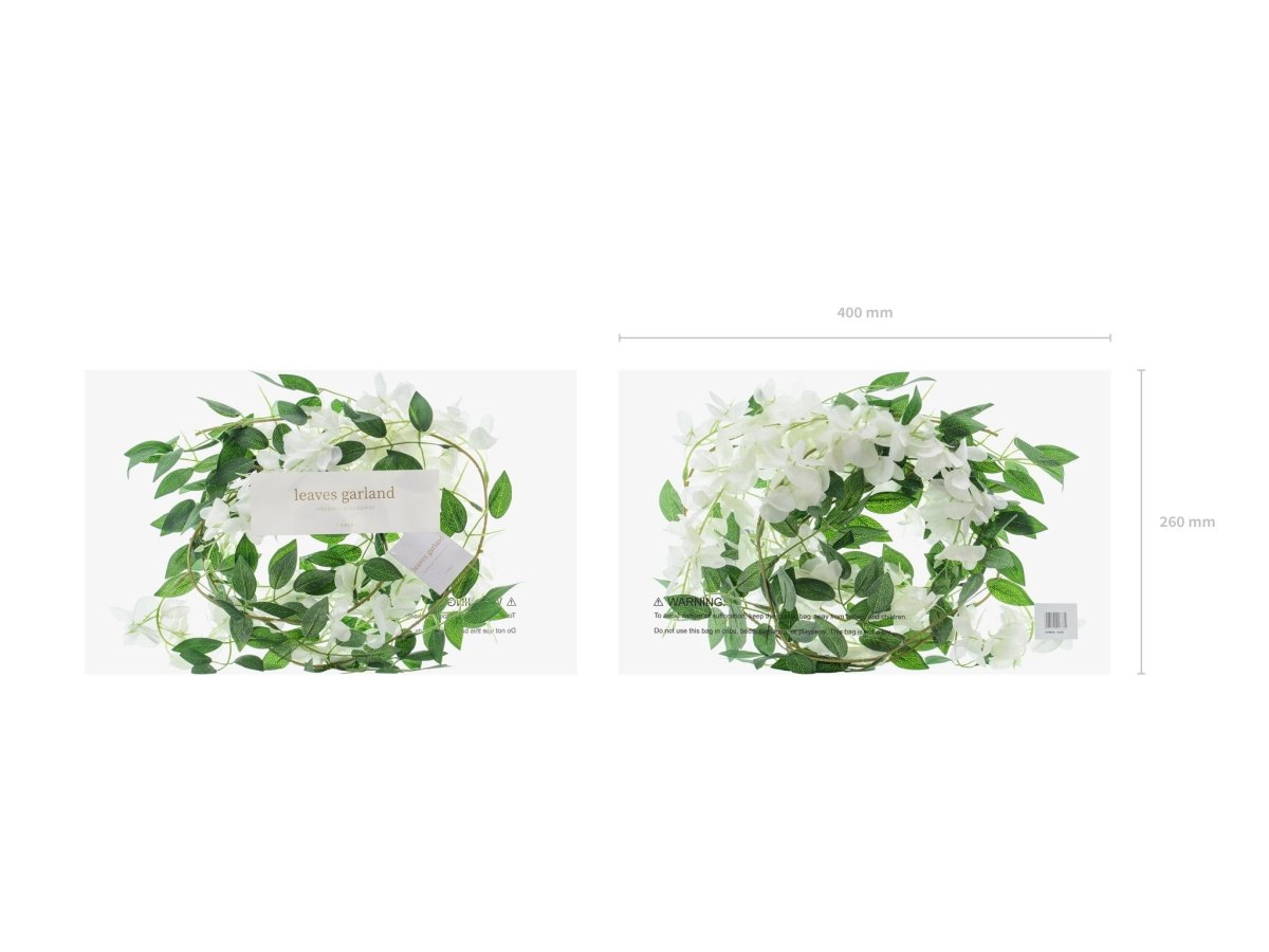 Wisteria seppele, valkoinen ja vihreät lehdet, korkeus noin 8 cm, pituus noin 1,7 m.