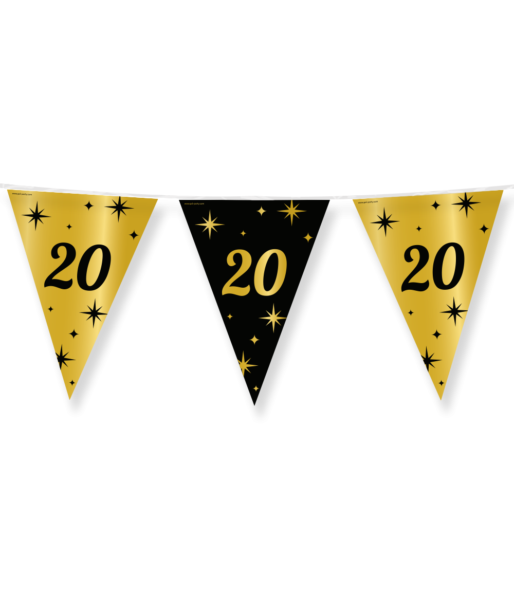 Tyylikkäät juhlaliput 20 ovat ihanteellinen koriste 20-vuotissyntymäpäiville. Mustankultainen väri ja tyylikäs muotoilu tekevät näistä juhlalipuista erottuvat! Molemmin puolin painetut liput on valmistettu foliosta, ja niiden pituus on 10 metriä. koristeet.