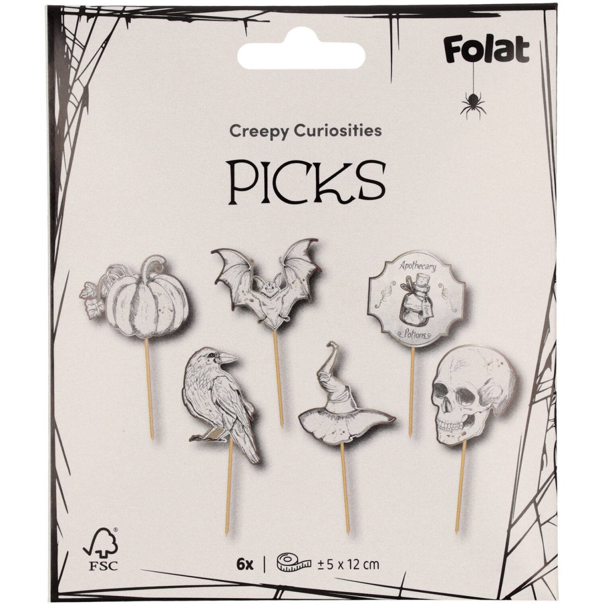 Kammottavia kuriositeetteja! Prickers - Creepy Curiosities - 6 kpl. Sisältö: 6 hammastikkua. Käytettäväksi esimerkiksi seuraavissa juhlissa/juhlatilaisuuksissa: Halloween, teemajuhlat. Pistele Halloween-juhlissa näillä 6 piikillä: kurpitsa, korppi, lepakko, noitahattu, taikajuoma, pääkallo. Piikit ovat kooltaan noin 5 x 12 cm. Painettu kaksipuolisesti ja todella kiiltävät kultaiset yksityiskohdat käytetyn kuumaleimaustekniikan ansiosta. Tämä tuote on valmistettu FSC-paperista.