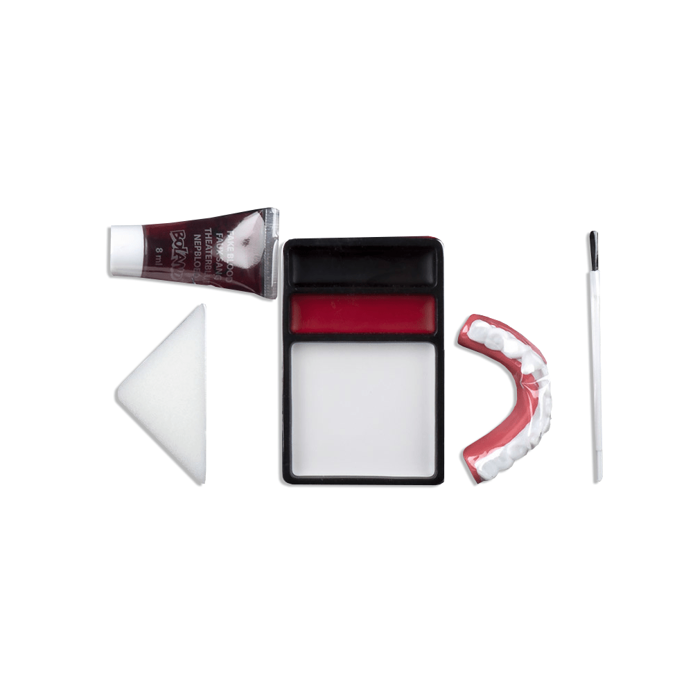 Pakkauksen sisältö: Meikkipakkaus Vampyyri vampyyrihampaat, tuubi tekoverta, rasva meikki, sieni ja applikaattori