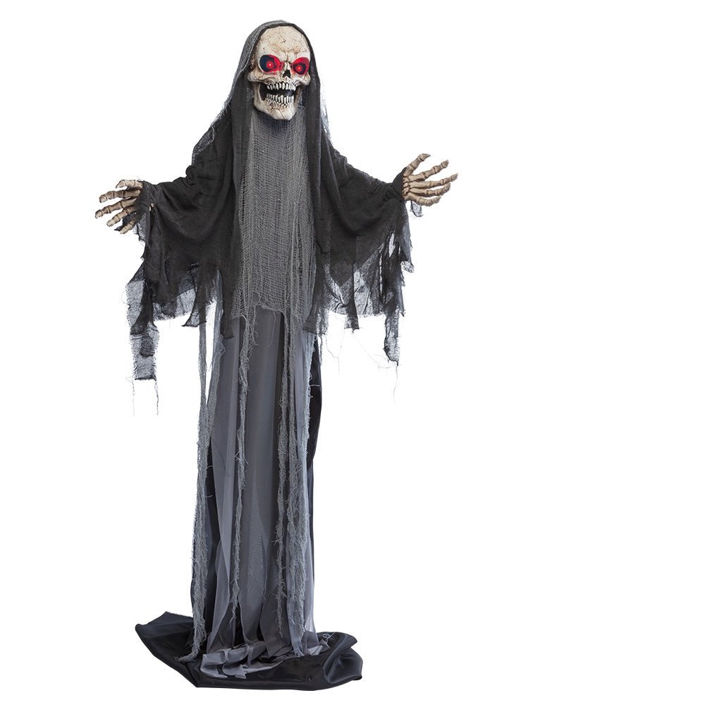 Tämä karmiva viikatemies on täydellinen Halloween-koriste, joka saa kaikki pelkäämään. Karmivan ulkonäkönsä ja punaisena hehkuvien silmiensä lisäksi tämä elävän kokoinen nukke herää myös henkiin heti, kun lähistöllä tapahtuu liikettä. Kun tämä viikatemiesnukke aktivoituu, se aiheuttaa painajaisia karmivilla äänillään ja kasvaa 180 cm:stä enintään 215 cm:iin, mikä tekee siitä entistäkin pelottavamman! Todellinen pakollinen koriste kummitustaloihin ja halloween-tapahtumiin.