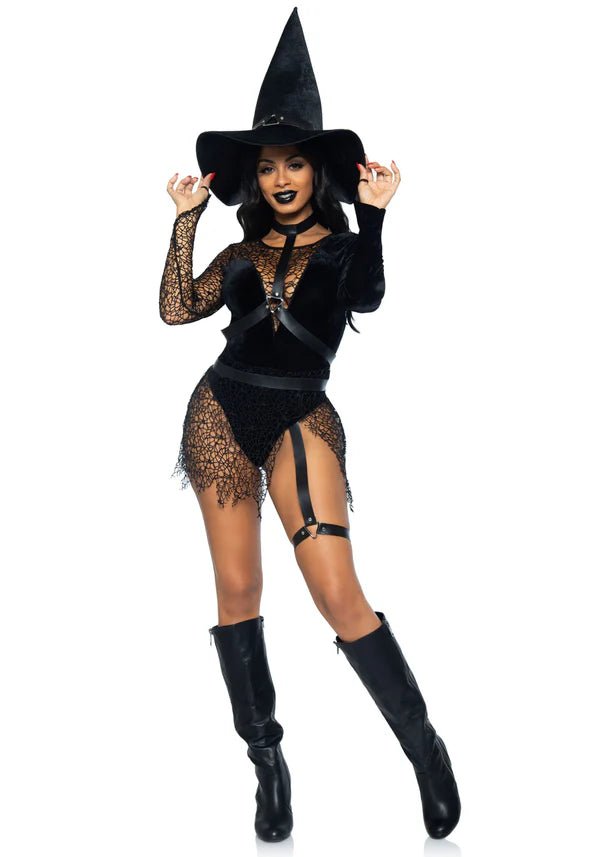 Jätä voimasi ja viehätysvoimasi loistamaan ultraseksikkäässä noitajattaren pukusetissä Leg Avenuelta! Tämä puku koostuu samettisesta bodysta, jossa on syvä V-pääntie ja painonappikiinnitys jalkoväliosassa, ja sitä täydentävät keinonahkaiset valjaat, joissa on sukkanauha, sekä klassinen samettinen noitahattu. Lumoavat verkkokerrokset ja viettelevä jalkanauha tekevät tästä lookista vastustamattoman, täydellisen Halloweeniin tai maagiseen teemajuhlaan! 🖤🌙