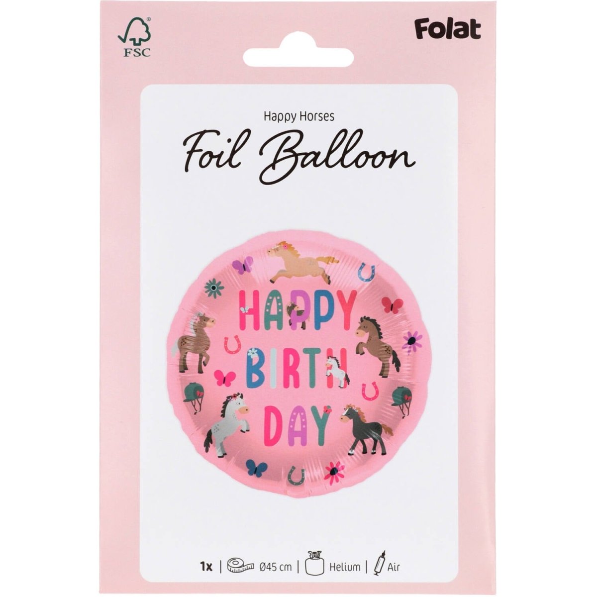 Mikä iloinen hevospallo! Foliopallo - onnellinen hevonen - 45cm. Sisältö: 1 foliopallo. Käytettäväksi esimerkiksi seuraavissa juhlissa/juhlatilaisuuksissa: Lastenjuhlat, Syntymäpäivä. Jokainen syntymäpäivien hevosfani ilahtuu tästä foliopallosta. Ilmapallo on pehmeän vaaleanpunainen ja siinä on teksti "HAPPY BIRTH DAY", onnellisia hevosia ja kaikkea siihen kuuluvaa. Sopii heliumille ja valolle. Helppo ripustaa "ripustuslapun" ansiosta. Tämä foliopallo kuuluu Folatin Happy Horses -mallistoon. Tämä tuote on valmistettu foliosta.