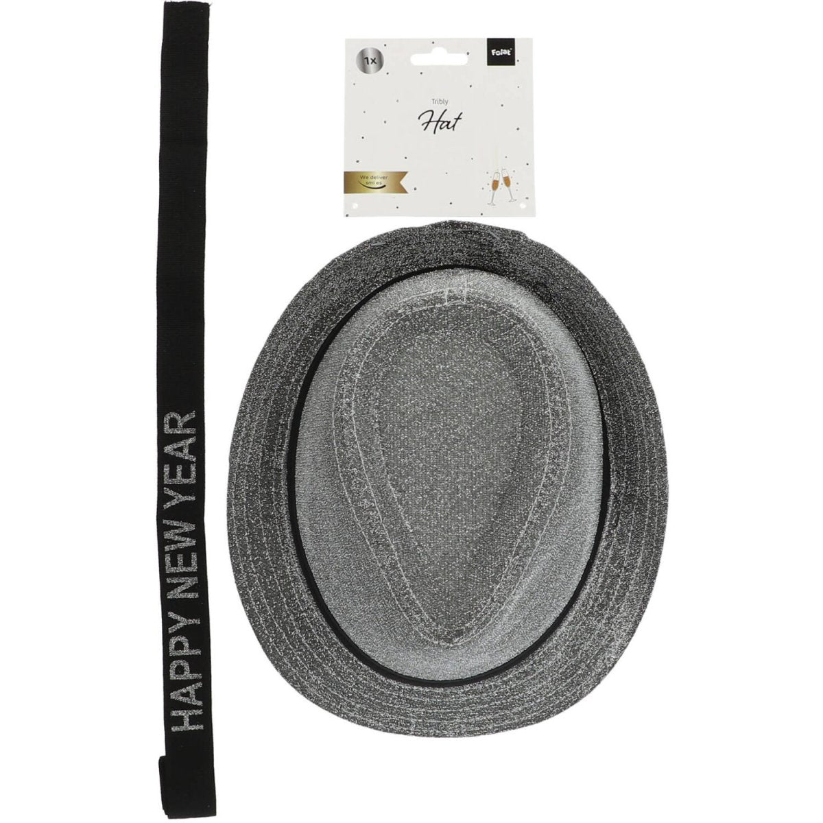 Trilby-hattu 'Happy New Year' Lurex Silver. Sisältö: 1 hattu. Väri: Hopeanvärinen. Käytetään esimerkiksi seuraavissa juhlissa/juhlatilaisuuksissa: Vanha &Uusi ja teemajuhlat. Hatun koko: 59 cm. Hatussa on irrotettava nauha, jossa on teksti "Hyvää uutta vuotta". Irrota nauha ja käytä hattua muissa teemajuhlissa. Tuote on valmistettu polyesteristä.