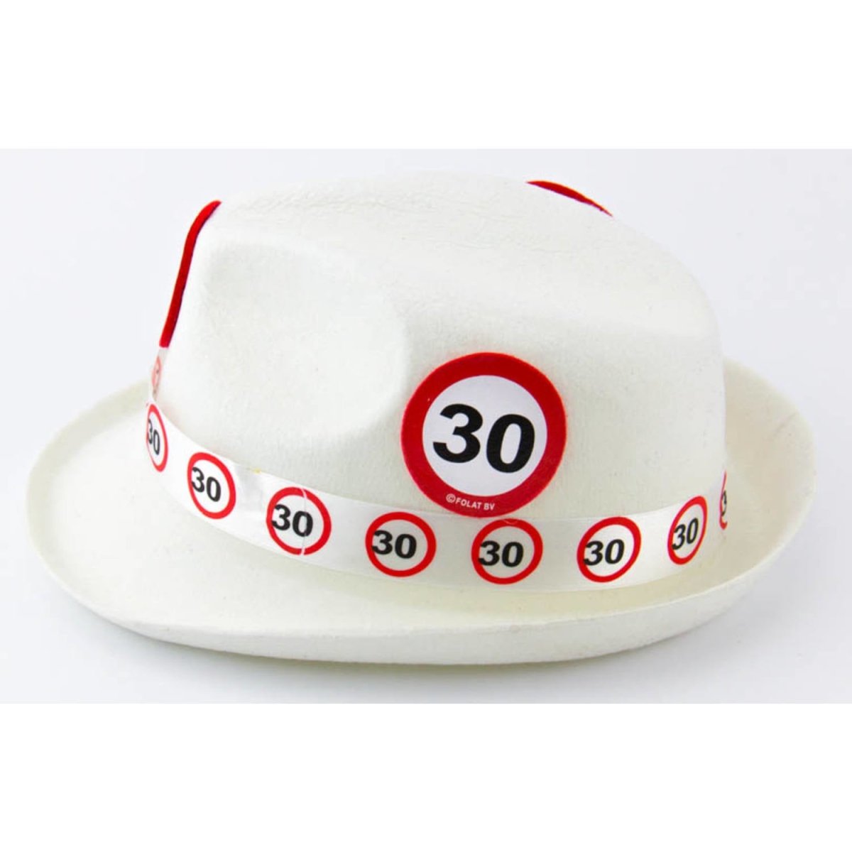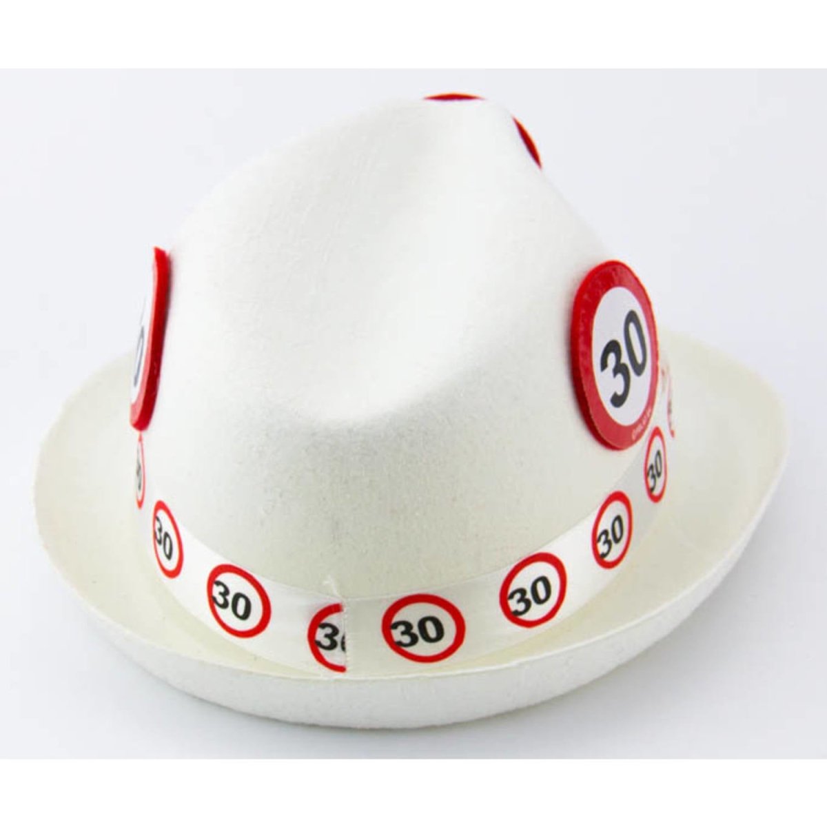 30 vuoden liikennemerkki Trilby-hattu valkoinen. Sisältö: 1 hattu, väri: valkoinen. Käytettäväksi esimerkiksi seuraavissa juhlissa/juhlatilaisuuksissa: Karnevaalit, teemajuhlat, Halloween. Tämä hattu on 23cm leveä ja 37cm korkea. Tuote on valmistettu polyesteristä.