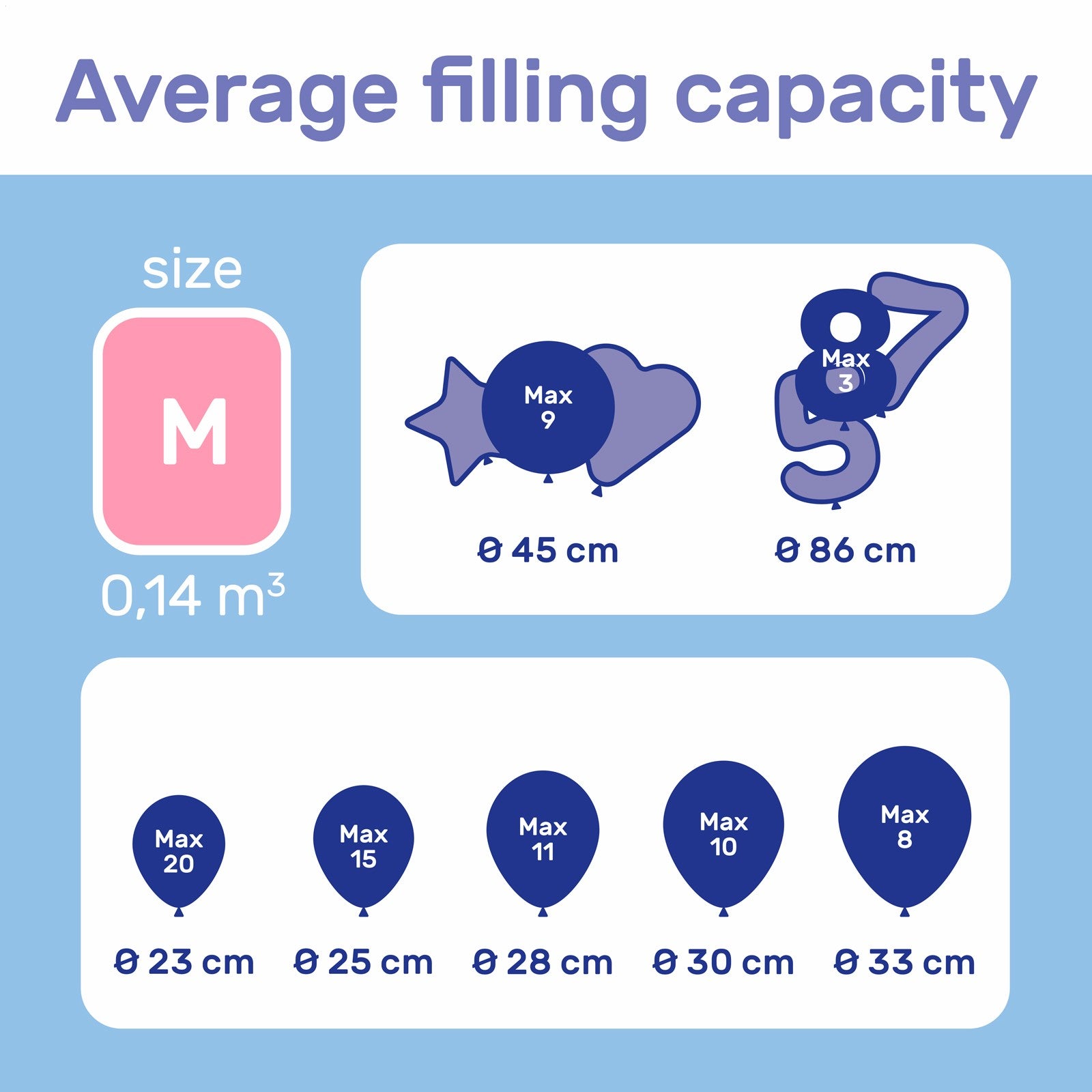Jokainen senttimetri, jonka ilmapallo on suurempi, vaikuttaa sen kapasiteettiin. Heliumsäiliöt perustuvat 25cm ilmapalloihin, jos käytät esimerkiksi 30cm ilmapalloja, saat heliumsäiliöstä vain puolet enemmän irti.