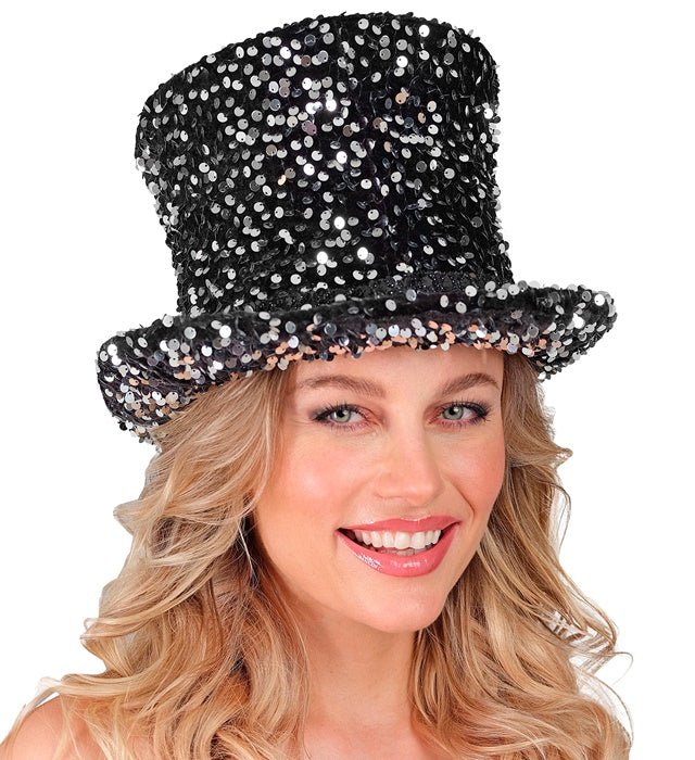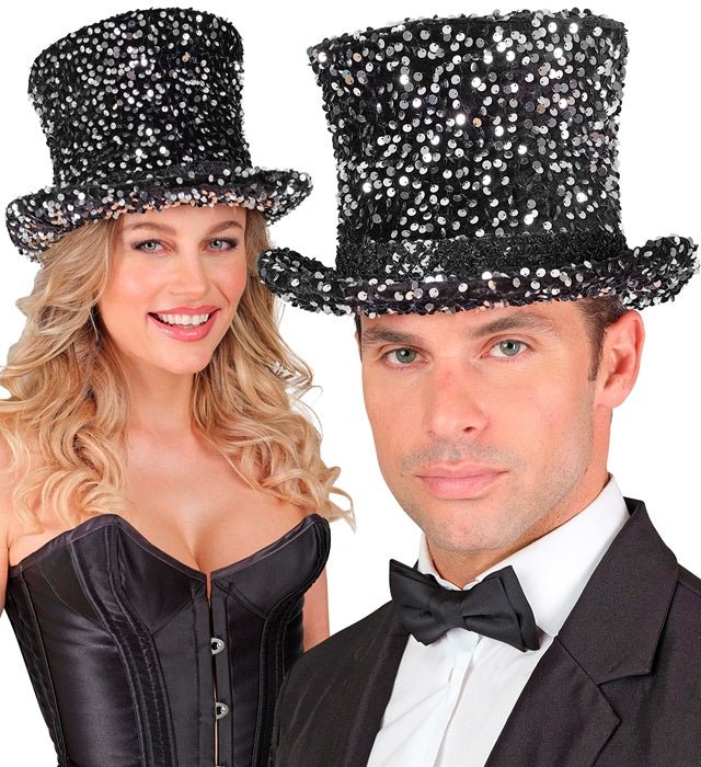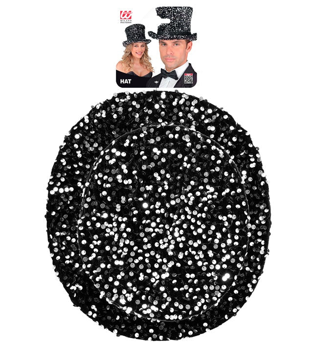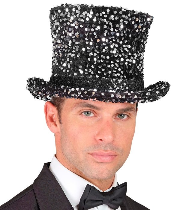Tee tyylikäs ja juhlava vaikutelma tällä mustilla ja hopeisilla paljeteilla koristellulla silinterihatulla. Täydellinen naamiaisiin, karnevaaleihin, esityksiin tai glamourisiin tapahtumiin.