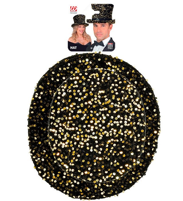Anna asullesi ylellinen ja huomiota herättävä ilme tällä mustilla ja kultaisilla paljeteilla koristellulla silinterihatulla. Täydellinen juhlatilaisuuksiin, teemajuhliin ja naamiaisiin.