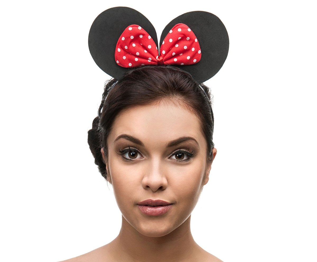 Sisältö: Hiiren hiuspanta, musta, jossa punainen rusetti valkoisilla pisteillä.
