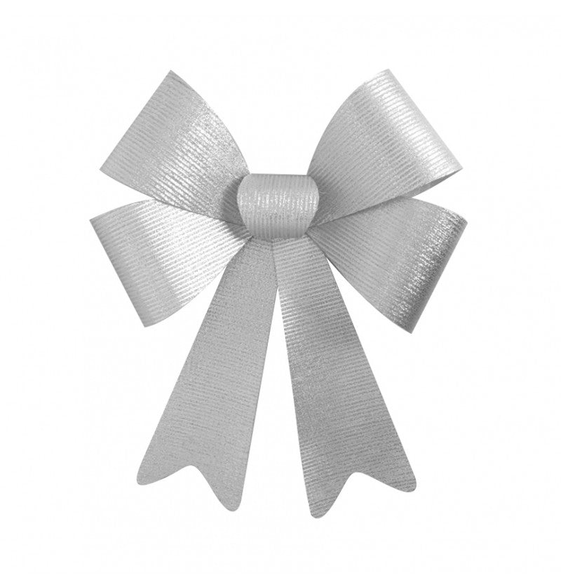 Tämä suuri hopeinen rusetti, jossa on glitteriä ja hienovaraisia raitoja, sopii täydellisesti juhlakoristeeksi, lahjoiksi ja näyttävään pukeutumiseen. Runsaan kokonsa ja tukevan materiaalirakenteensa ansiosta rusetti säilyttää muotonsa kauniisti ja antaa ylellisen ilmeen.