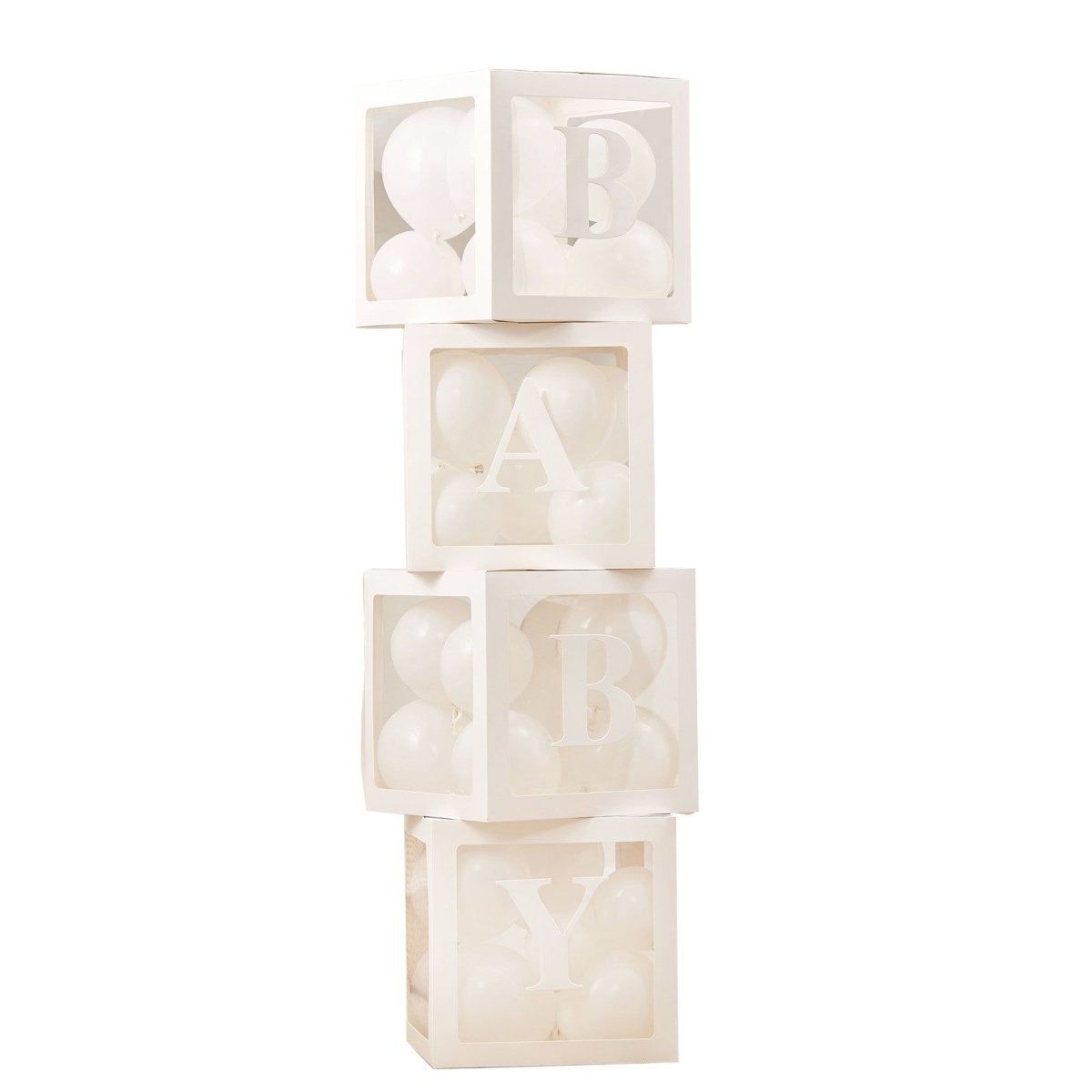 Jokainen pakkaus sisältää 4 x 30cm x 30cm laatikkoa, joissa on asetaatti-ikkuna. 60 x 5 tuuman valkoisia ilmapalloja 2 x B-tarraa 1 x A-tarraa 1 x Y-tarraa
