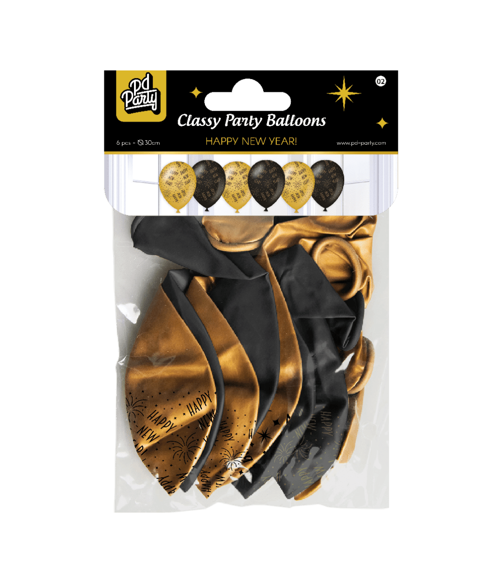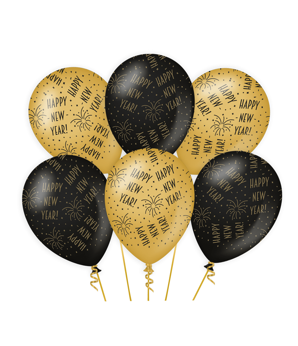 Ilmapallot Hyvää uutta vuotta kultainen musta 30cm 6kpl