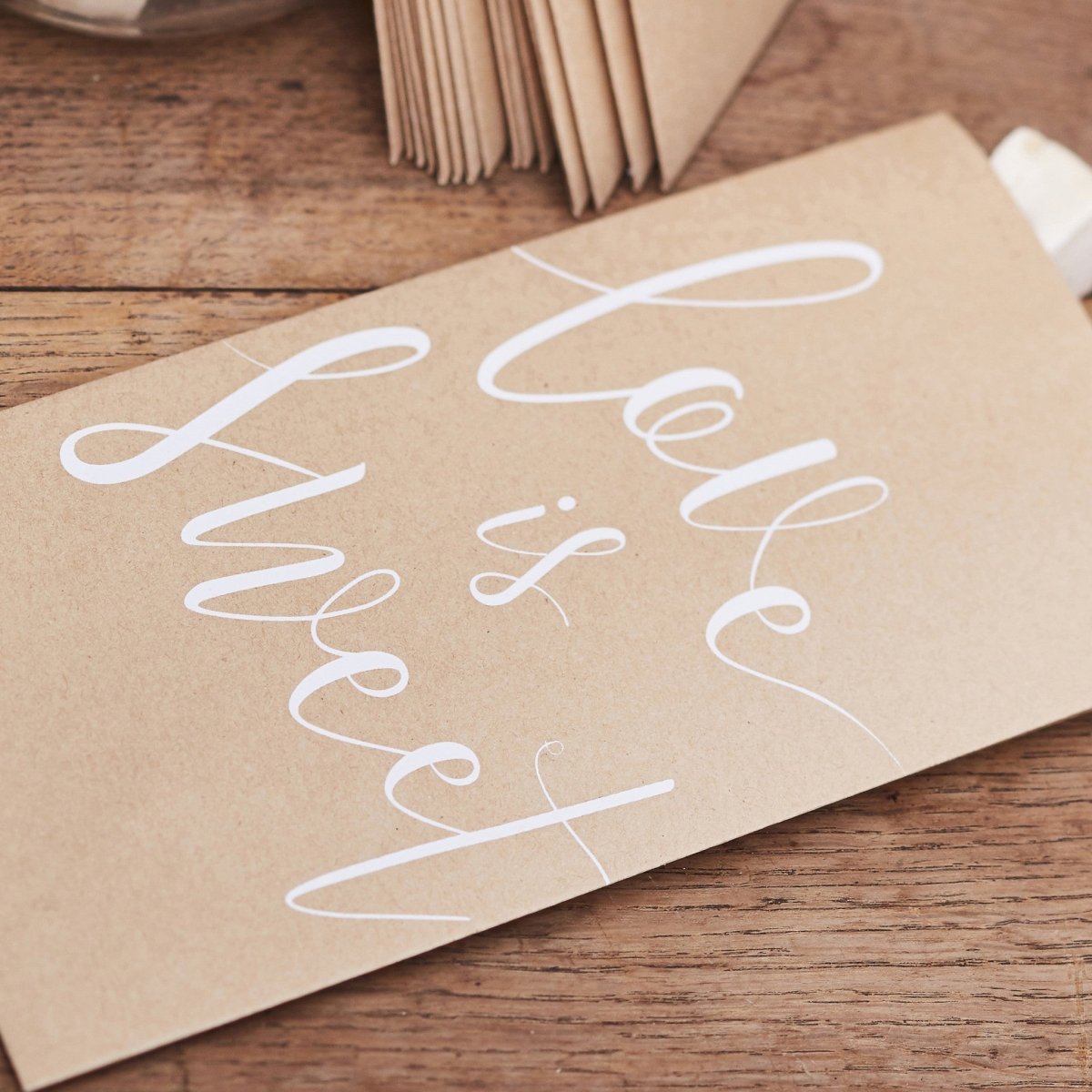 Lisää täydellinen kosketus vastaanotollesi karkkipusseillamme häät kiitoskarkkeja varten maalaismaisesta voimapaperista. Kaikenikäiset vieraat tulevat rakastamaan näiden täyttämistä herkullisilla makeisilla - todellinen herkkupala vieraiden hemmotteluun. Valkoinen skripti näyttää upealta aarrekirjapöydälläsi - täysin vastustamaton.