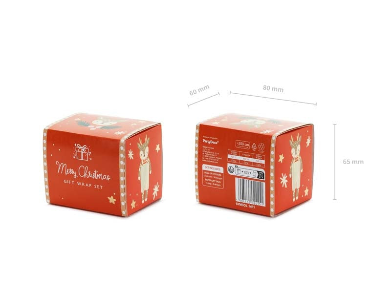 Minitarrat Merry Christmas, eri värejä. Setti sisältää n. 250 cm:n pituisen rullan, jossa on 52 tarraa 36 eri kuviossa ja 16 tarraa 8 eri kuviossa. Materiaali: foliolla päällystämätön ja lakkaamaton paperi - 95%, puuvilla - 5%.