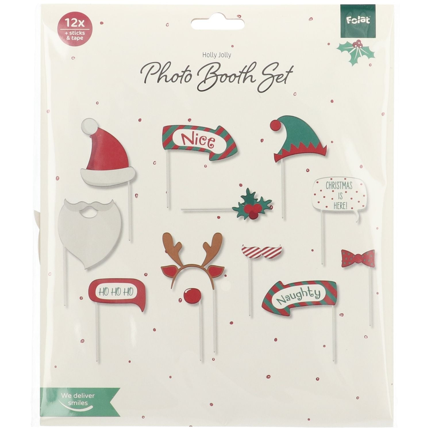 Hymyile! Photobooth-tarvikkeet, Holly Jolly, 12 kpl. Sisältö: 12 valokuvauskoppitarviketta. Käytettäväksi esimerkiksi seuraavissa juhlissa/juhlatilaisuuksissa: Joulu. Aina hauskaa valokuvauksessa näiden photobooth-tarvikkeiden avulla. Hahmot on valmistettu yksipuolisesti painetusta paperista, tikut muovista. Mukana on kaksipuolisia tarroja, joilla hahmot kiinnitetään tikkuihin. Tämä artikkeli on valmistettu paperista ja muovista