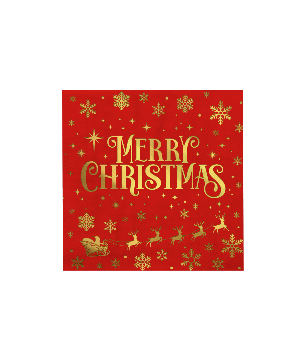 Täydennä joulupöytä näillä tyylikkäillä punaisilla lautasliinoilla, joissa on kultainen Merry Christmas -painatus. Lautasliinat on valmistettu paperista, ja ne tuovat heti juhlallisen tunnelman mihin tahansa jouluillalliseen, brunssille tai drinkkitilaisuuteen.
