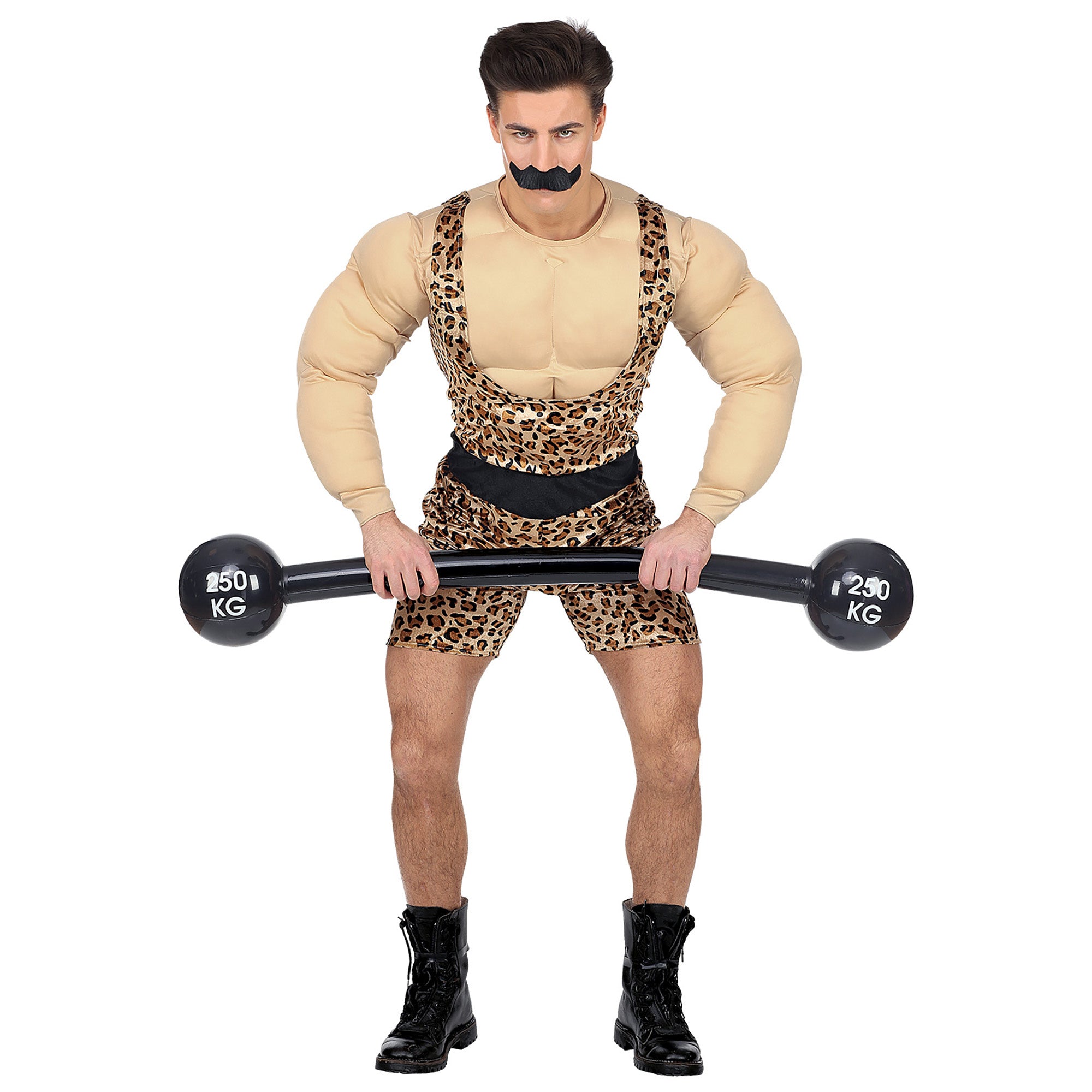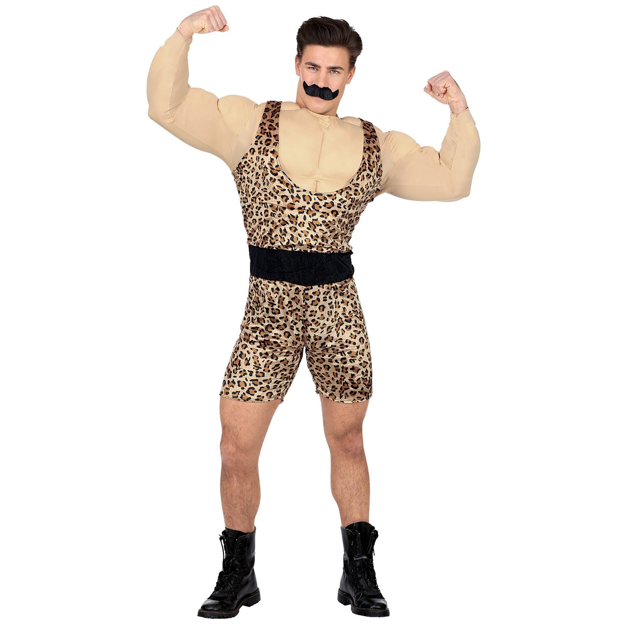 Kuvaus: vahva miehen haalari, jossa on lihaksikas paita ja vyö, viikset
