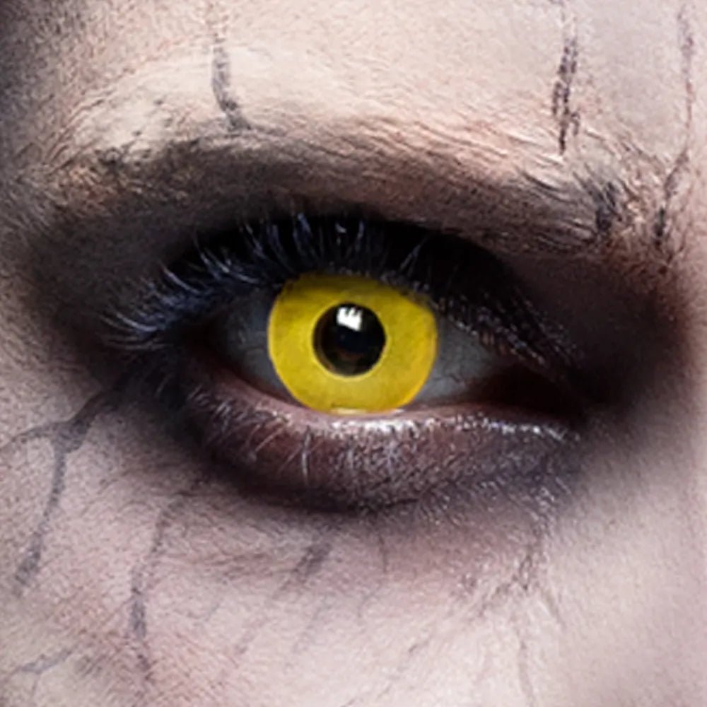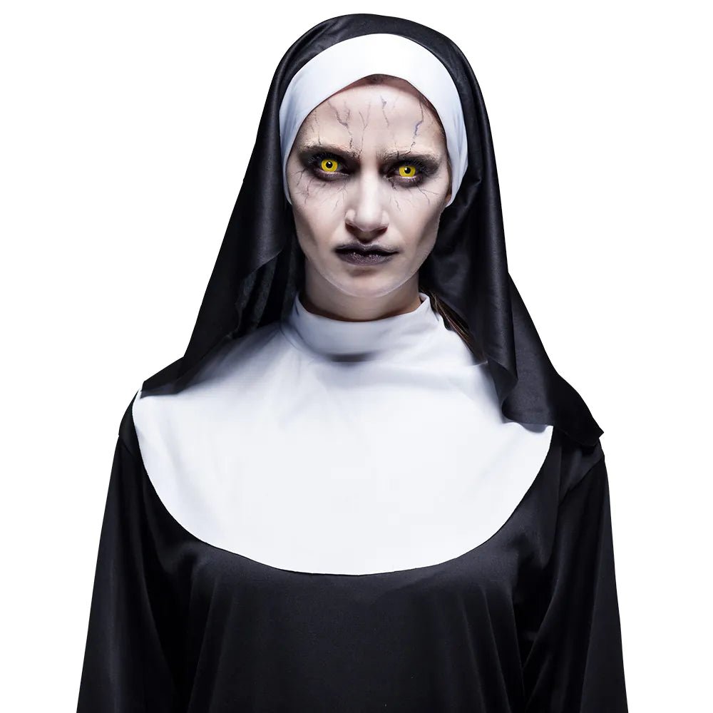 Näillä kirkkaan keltaisilla UV-salamalinsseillä on helppo katsoa jotakuta lävistävästi. Ne syttyvät mustassa valossa, joten pelottava katse on taattu. Yhdistettynä tummaan nunnapukuun tai nunnalakkiin teet siitä todella karmean. Näitä pehmeitä reseptivapaita Halloween-linssejä voi käyttää 1 kuukauden ajan, joten voit käyttää niitä ihmisten pelotteluun vielä juhlien jälkeenkin.