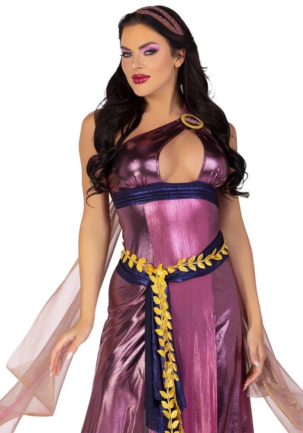Omaksu sisäinen kreikkalainen jumalattaresi 3-osainen Megara-setti Leg Avenuelta! Tähän lumoavaan asuun kuuluu toisesta olkapäästä korostettu, nauhalla koristeltu epäsymmetrinen kiiltävä mekko, siihen kiinnitetty irisoiva draping-kangas sormilenkillä, lehtikuvioinen kultainen vyö ja yhteensopiva hiuspanta. Täydellinen naamiaisiin, Halloweeniin tai näyttämään voimasi ja kauneutesi! 🏛️🎭