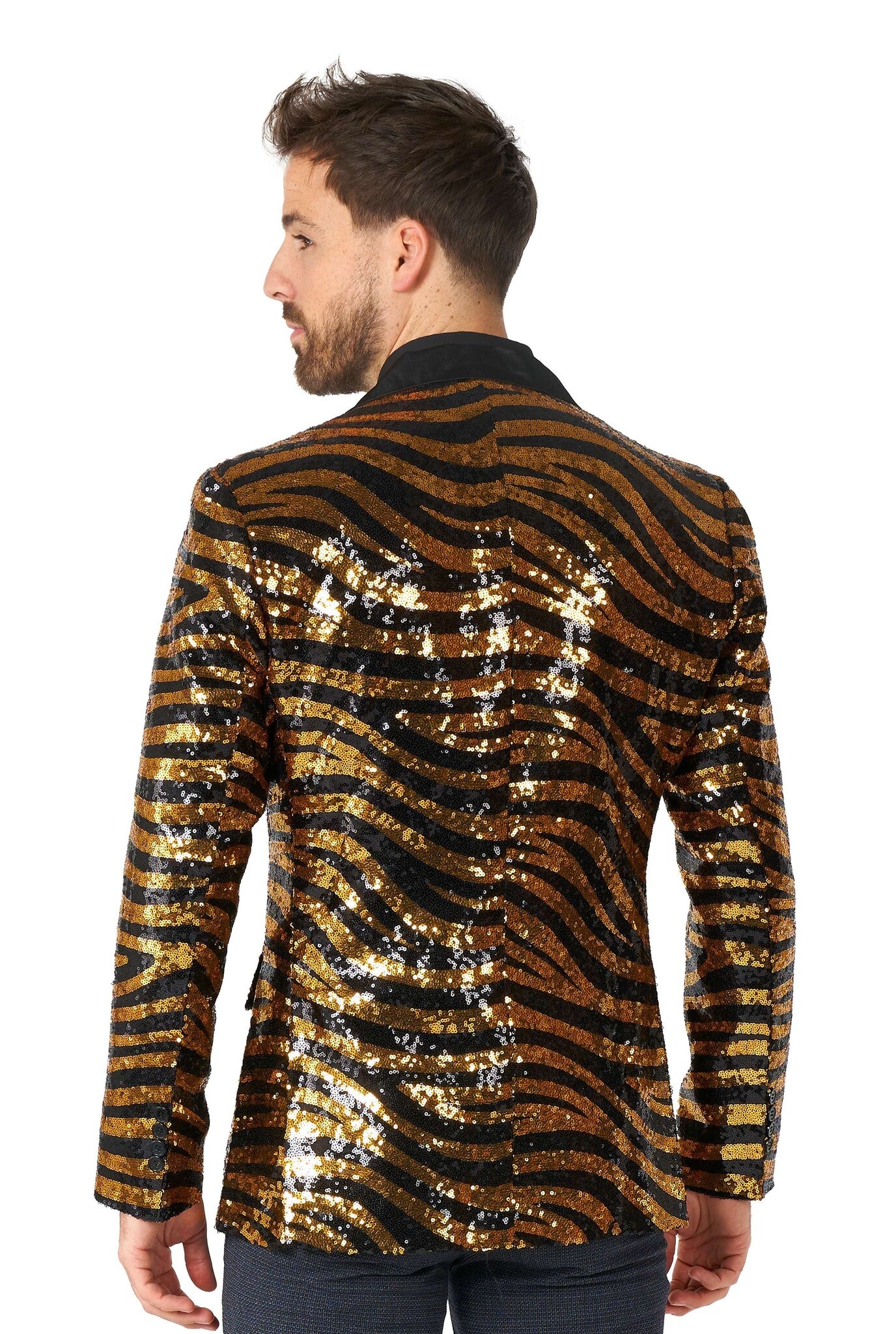 Juhlijat eivät koskaan kaihda glitteriä ja glamouria. Jos haluat tehdä tanssilattiasta reviirisi, Tiger Royale -merkkinen bleiseri on kaikki mitä tarvitset. Tämä räikeä takki on päällystetty huomiota herättävillä paljeteilla, jotka korostavat, että olet sekä kesytön että muodikas joka tilanteessa. Get 'em, tiger!