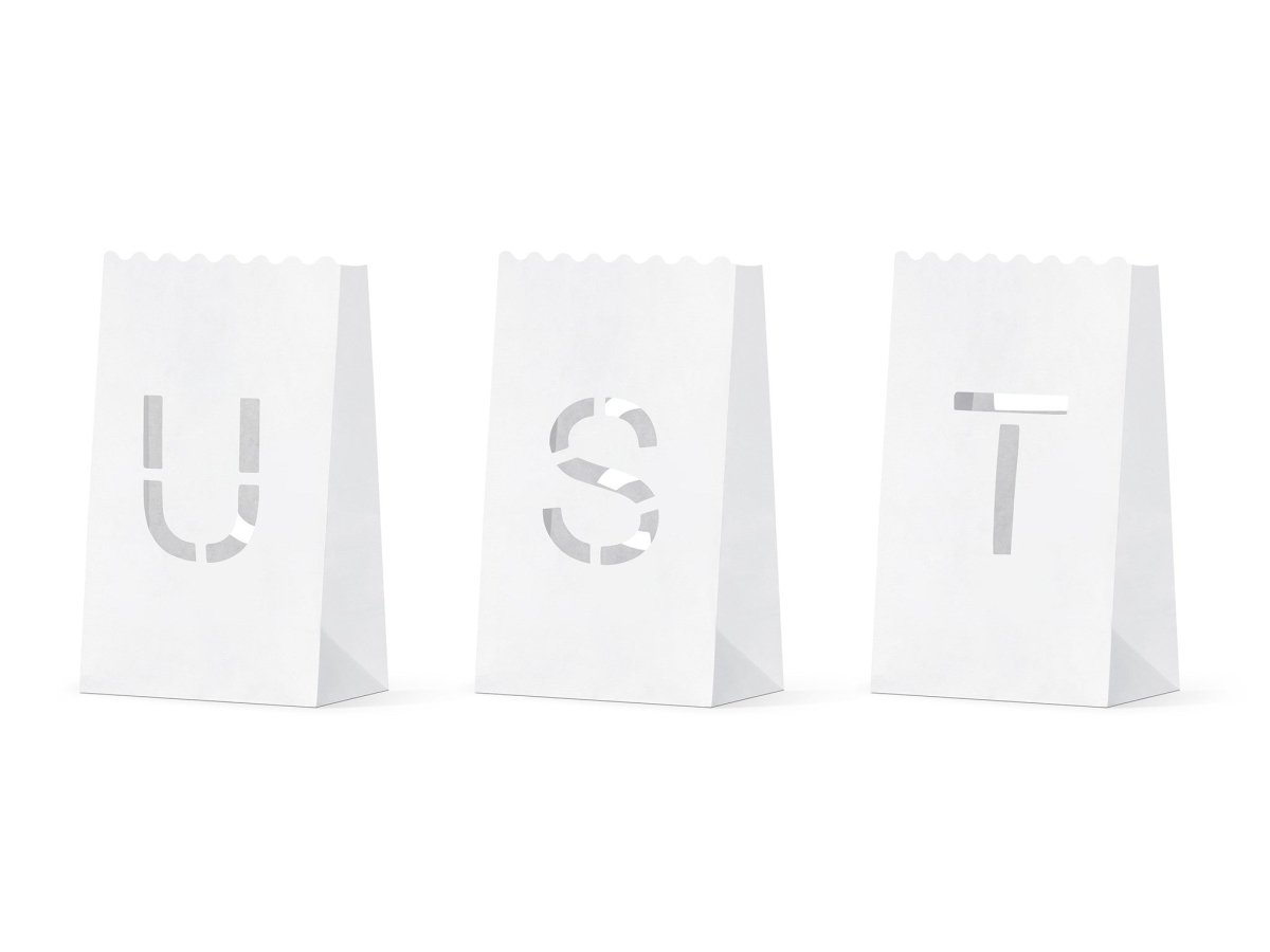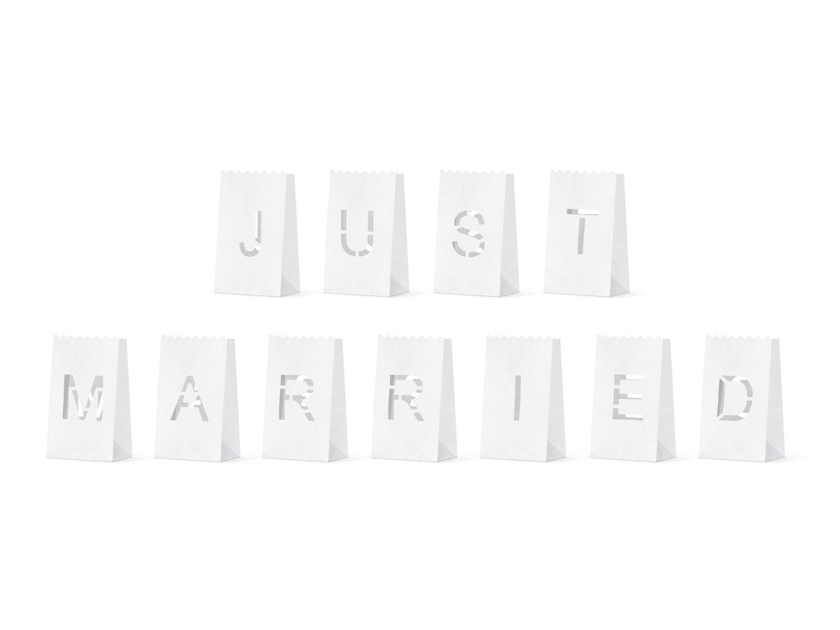 Pakkauksen sisältö: Kynttiläpussit Häät Just Married 19cm 11kpl Kappalemäärä: 11 kpl Pituus: 19cm Leveys: 11.5cm Korkeus: 7cm Sisältö: Kynttiläpussit Kynttiläpussit, setti sisältää 11 lyhtyä, joissa on kaiverrettuja kirjaimia, jotka luovat tekstin Just Married. Koko avaamisen jälkeen n. 11,5 x 19 x 7 cm. Tuote on valmistettu syttymättömästä paperista.(1 kpl/11 kpl) Paino: 10 grammaa Väri: valkoinen Materiaali: paperi