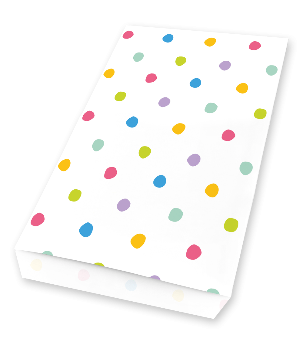 Lahjapussit - Party dots sopivat erinomaisesti herkkujen, pienten lahjojen tai iloisen herkkupussin tarjoamiseen juhlien päätteeksi. Värikäs pilkkuaihe sopii täydellisesti yhteen muun Party Dots -mallistonkanssa, joten siitä on helppo luoda kaunis kokonaisuus.