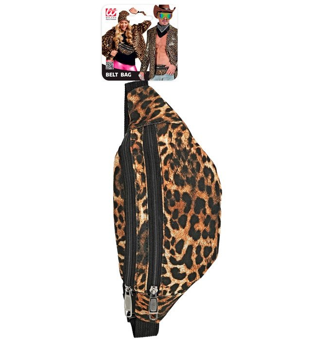 Tämä leopardikuvioinen lantiolaukku värissä ruskea ja musta on trendikäs ja käytännöllinen lisävaruste juhliin ja naamiaisiin. Täydellinen karnevaaleihin, teemaisiin juhliin, 80-luvun/90-luvun juhliin tai vääriin juhliin