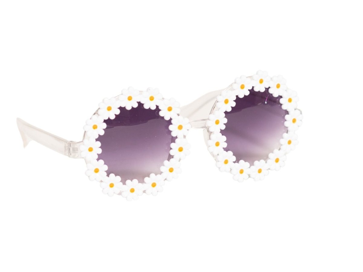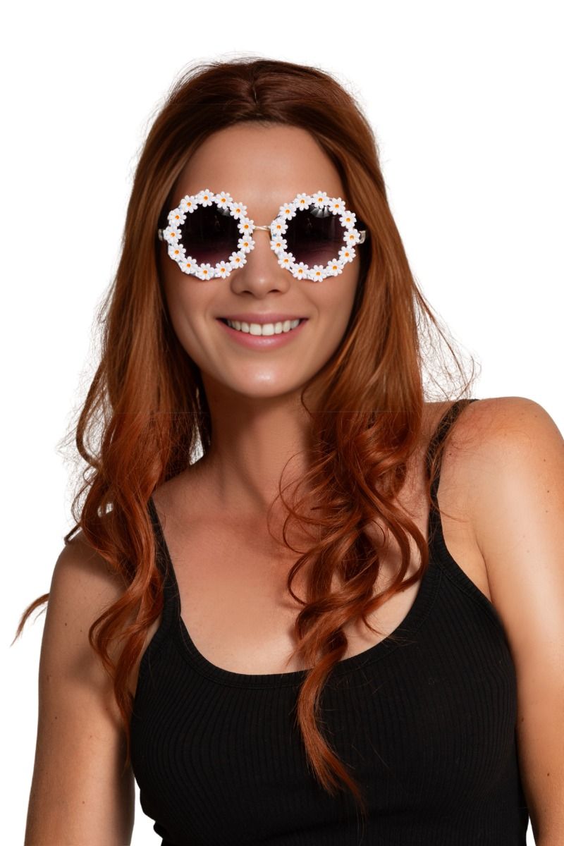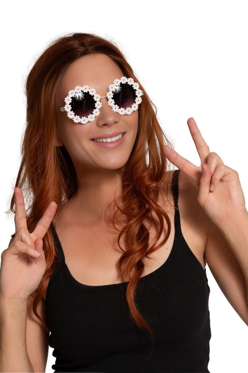 Nämä valkoisilla kukilla koristellut lasit ovat iloinen hippiasuste ja sopivat täydellisesti karnevaaleihin, naamiaisiin ja naamiaisjuhliin. Ihanteellinen täydentämään flower power -asua.