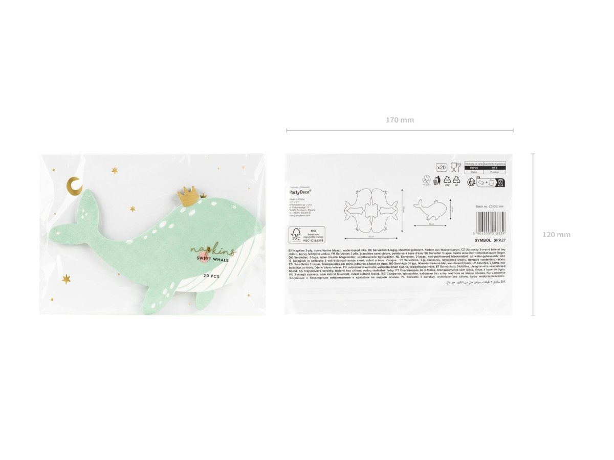 Paperiset lautasliinat Whale, värisekoitus kultaisella painatuksella, koko taitettuna noin 26,5 x 21,5 cm, koko taitettuna noin 16 x 10 cm.