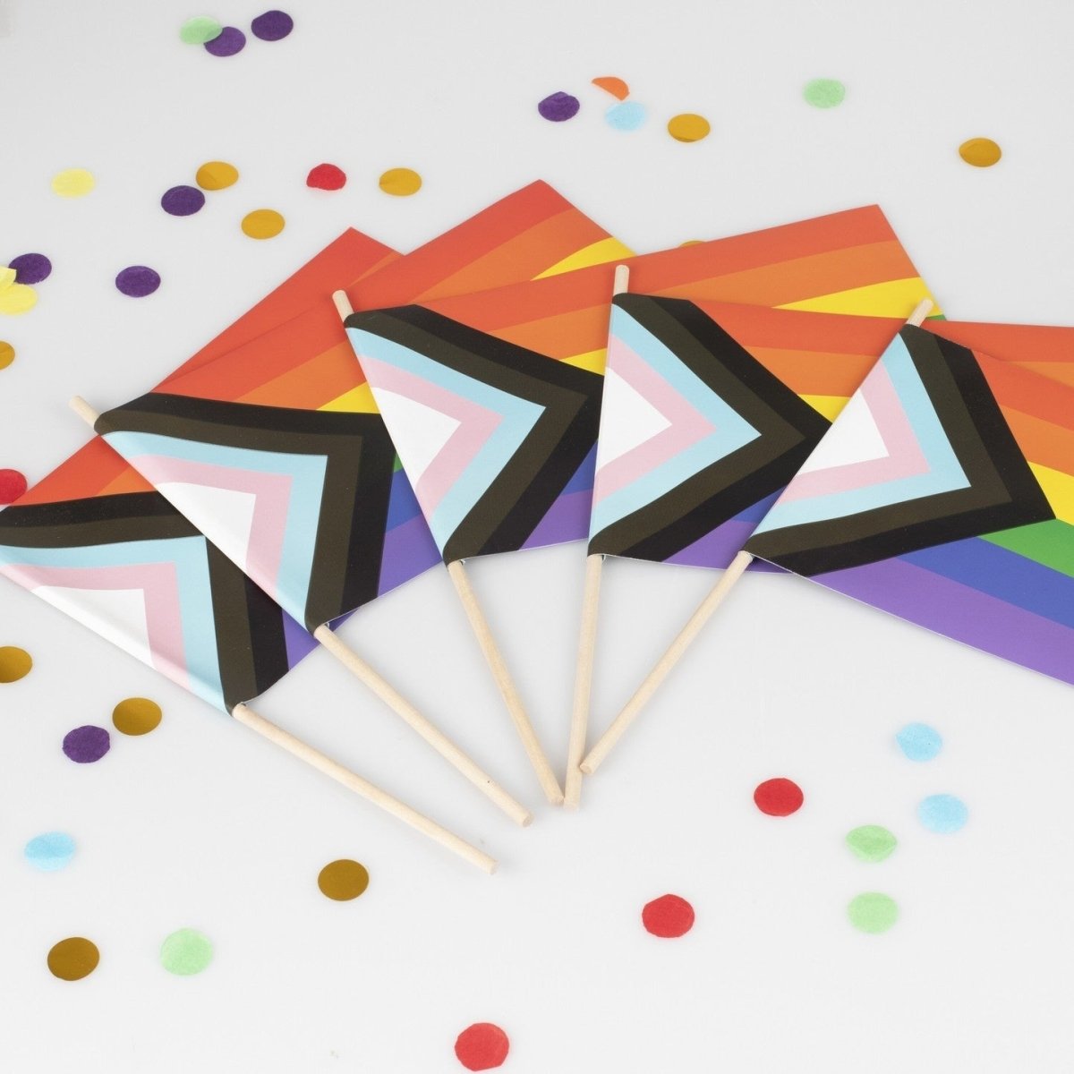 Juhli näiden värikkäiden käsilippujen kanssa! Tyylikkäät ja kevyet, nämä värikkäät liput ovat täydellisiä juhlia Pride-tapahtumissa, juhlissa, illanvietoissa ja festivaaleilla! Jokainen pakkaus sisältää 5 lippua, joiden mitat ovat 26cm (korkeus) x 22cm (leveys) x 1cm (syvyys).