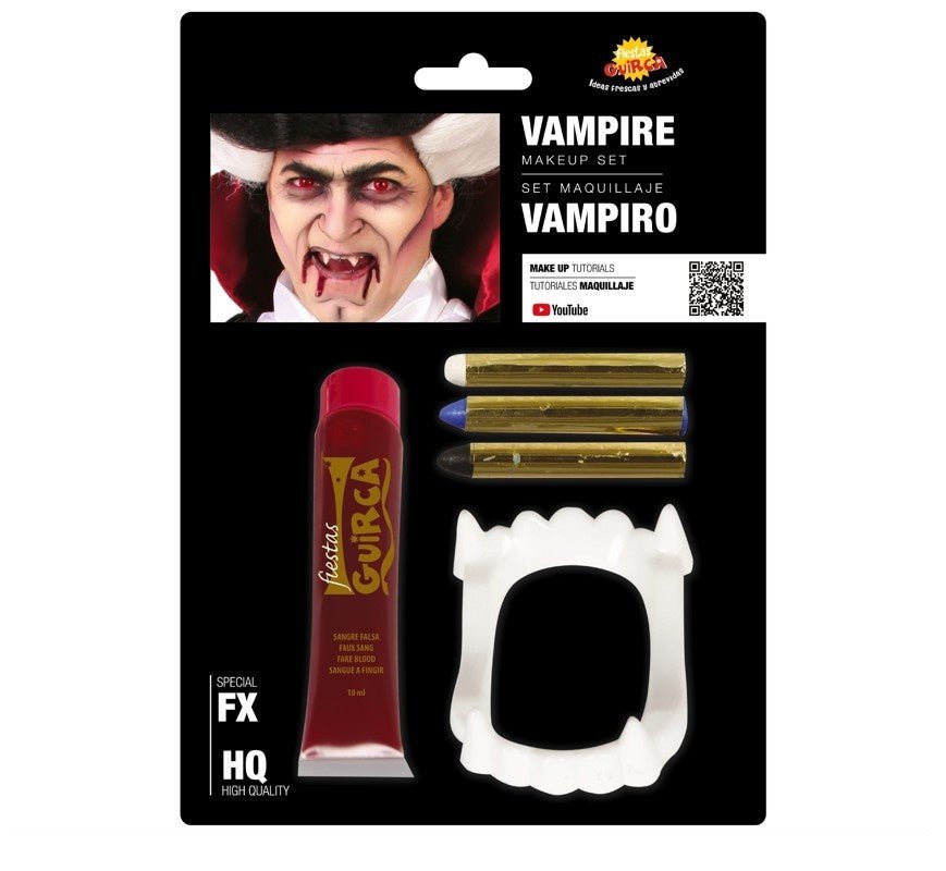 Sisältö: vampyyrin hampaat, 20ml tekoverta ja valkoinen, musta ja sininen meikkimerkki