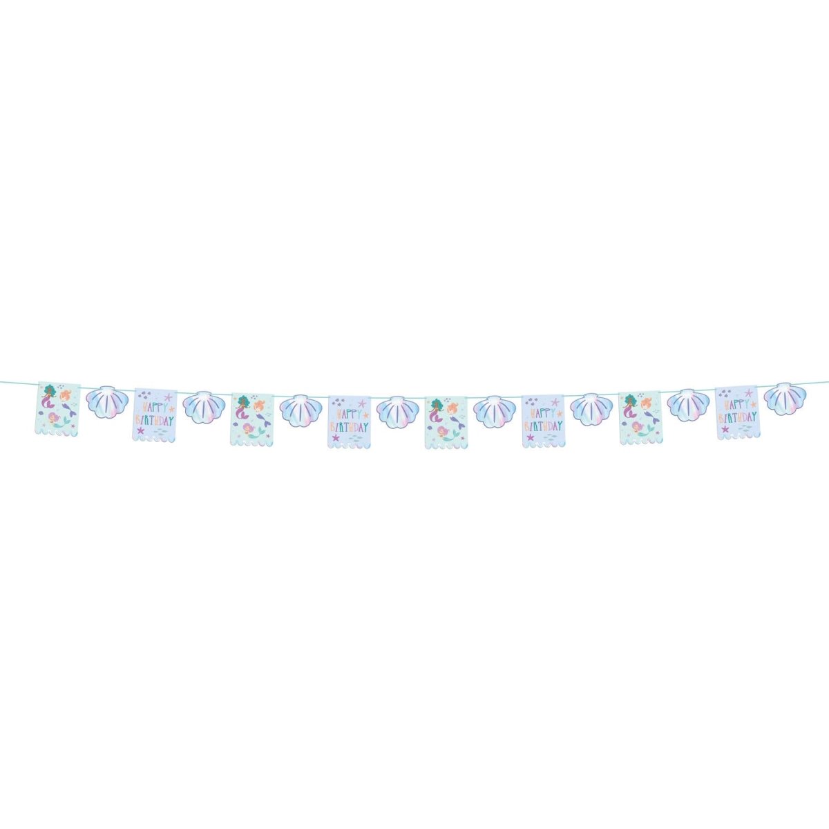 Kimmeltävä vedenalainen maailma. Lippusiima - Mermaid Magic - 6 metriä. Sisältö: 1 lippusiima. Käytetään esimerkiksi seuraavissa juhlissa/juhlatilaisuuksissa: Lastenjuhlat, Syntymäpäivä. Tämä lippusiima tekee juhlista todelliset merenneitojuhlat. Tässä 6 metriä pitkässä lippusiimassa on 16 noin 17 x 21 cm kokoista lippua. Lippuja on 3 erilaista: mintunvihreä lippu, jossa on 3 merenneitoa ja irisoiva kampareuna, parin/sininen lippu, jossa on teksti "HAPPY BIRTHDAY" ja irisoiva kampareuna, sekä täysin irisoiva lippu simpukan muodossa, joka antaa ylimääräistä vedenalaista kimallusta. Käytetyn kuumaleimaustekniikan ansiosta irisoivat osat todella kimaltelevat! Liput painetaan kaksipuolisesti. Niitä voi liu'uttaa edestakaisin turkoosinvärisen nauhan päällä. Tämä lippusarja kuuluu Folat Mermaid Magic -mallistoon. Tämä tuote on valmistettu paperista.